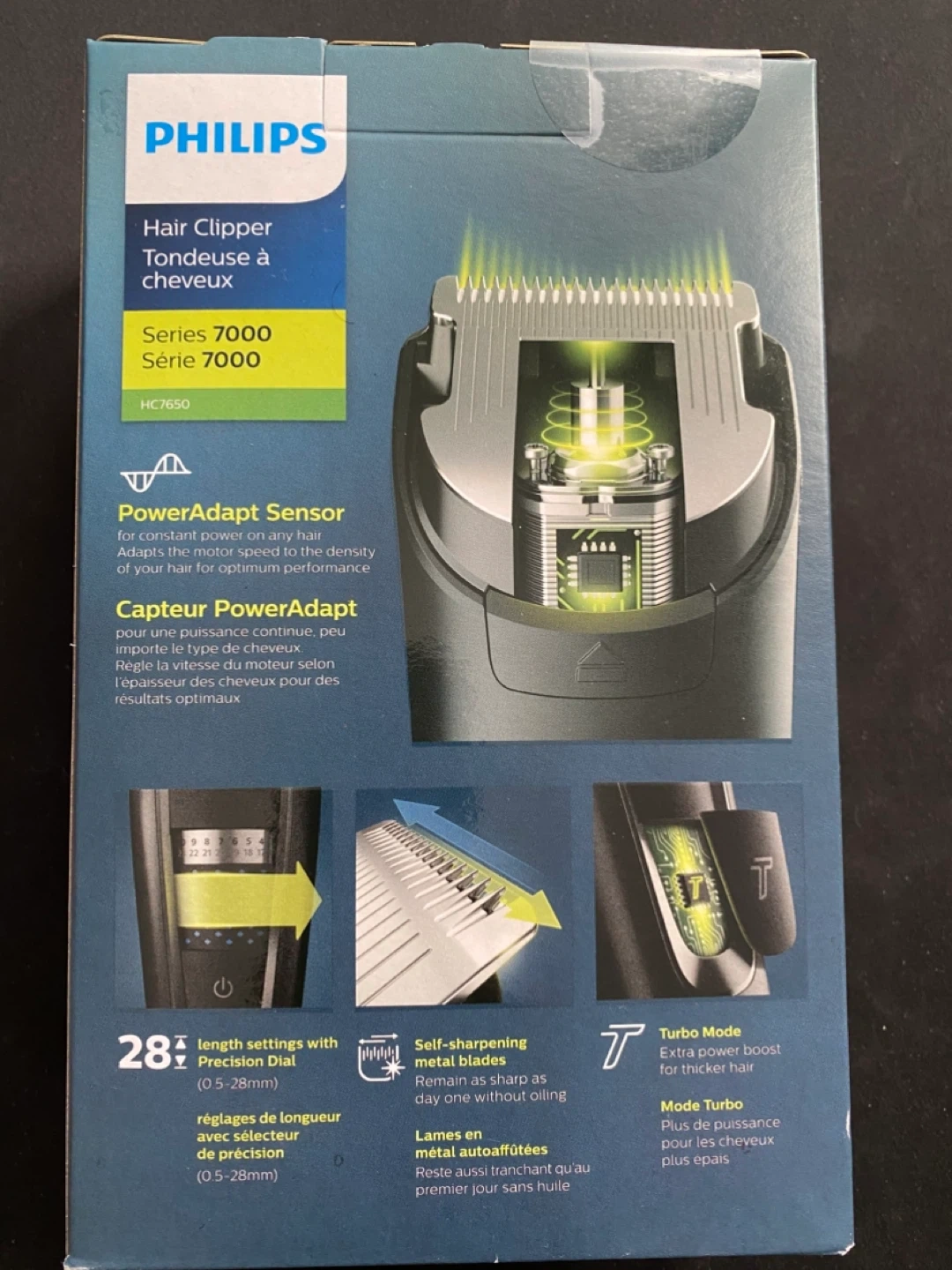 Philips Hair Clipper Series 7000 model HC7650. Features 28 length settings with Precision Dial (0.5-28mm) and self-sharpening metal blades. Offers 90 min runtime on 1h charge.