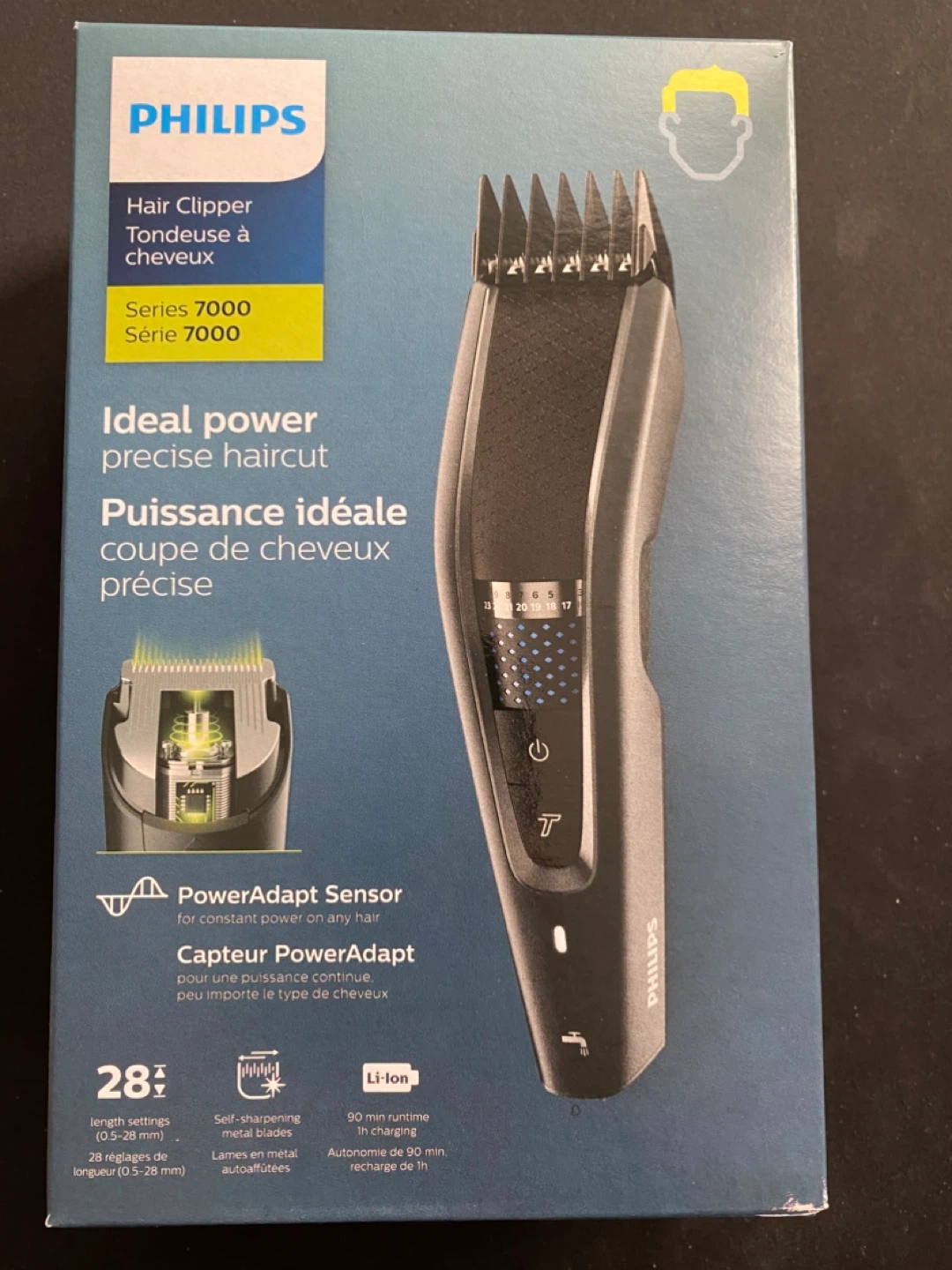 Philips Hair Clipper Series 7000 model HC7650. Features 28 length settings with Precision Dial (0.5-28mm) and self-sharpening metal blades. Offers 90 min runtime on 1h charge.