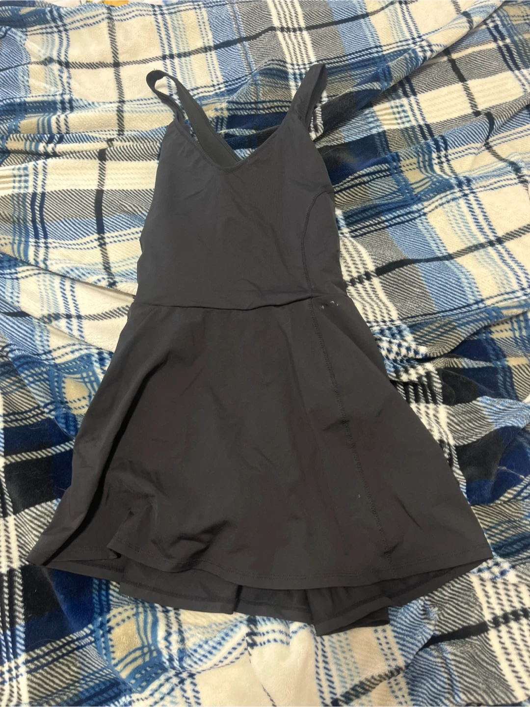 This is a black athletic dress. It features a V-neckline and a flared skirt. Made with a lightweight, quick-drying fabric. Pick up cash only