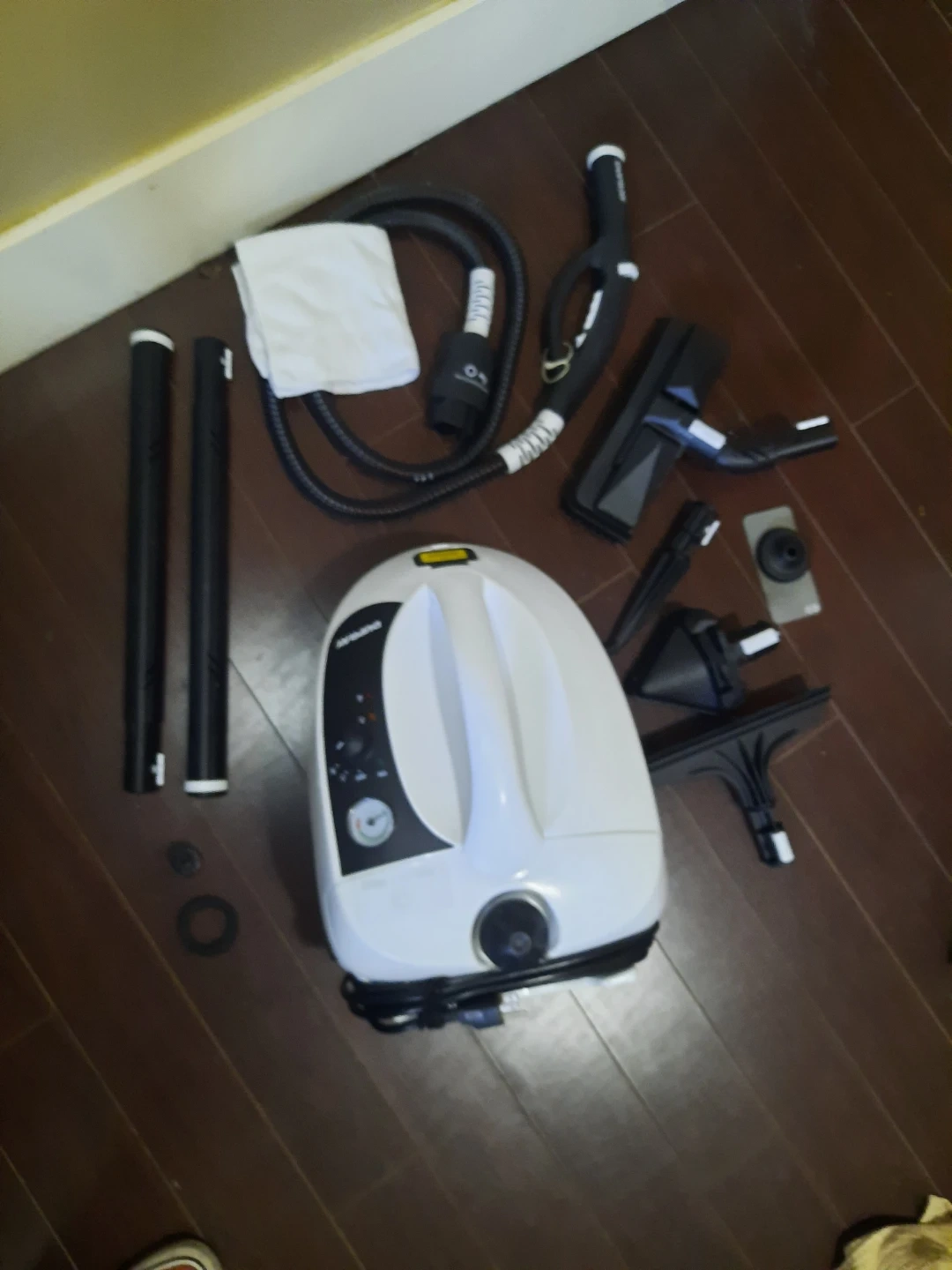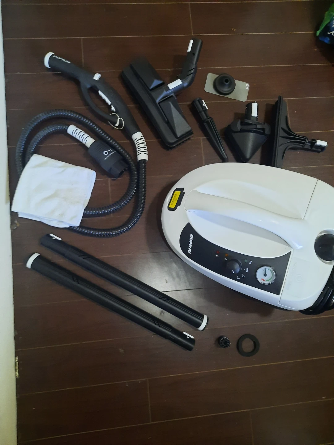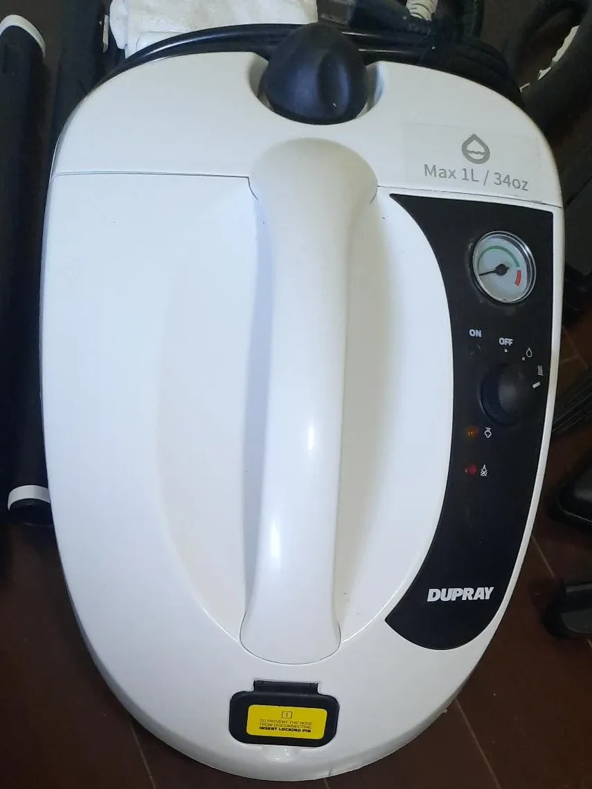 This is a Dupray steam cleaner, capable of holding a maximum of 1 litre or 34 ounces. It comes with various attachments for different cleaning tasks. It's great for sanitizing surfaces without chemicals. Never used tried to but didn't like it.