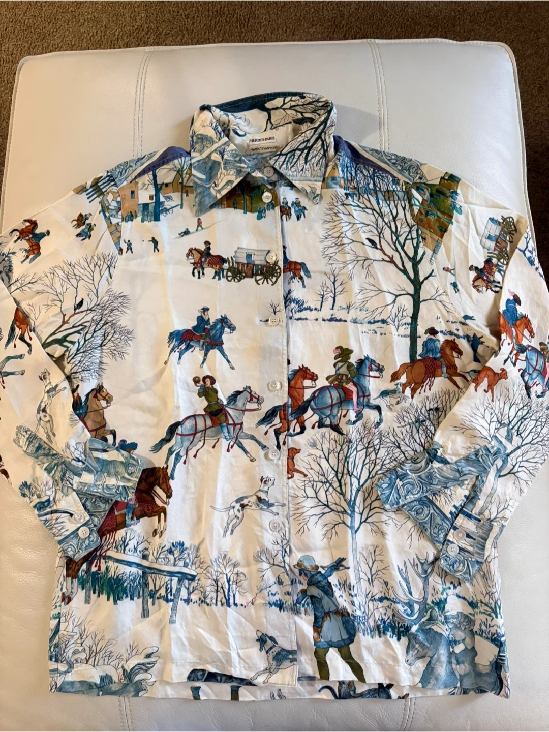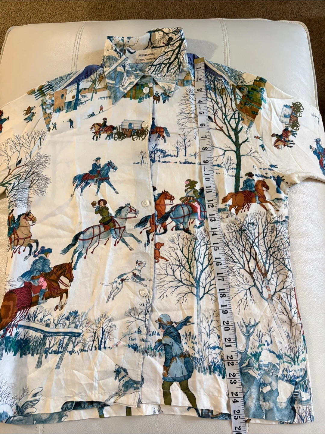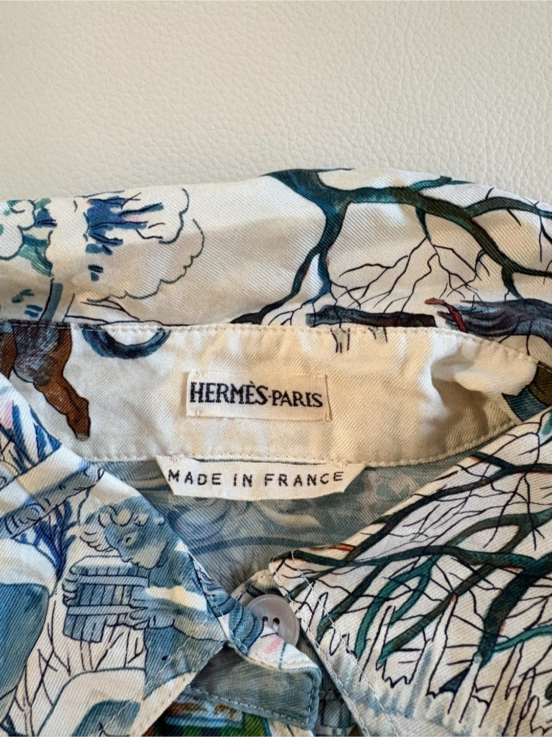 Vintage. Here's a stylish Hermès Paris button-up shirt! The shirt features a unique pattern with a winter scene. It's in great condition and ready to wear