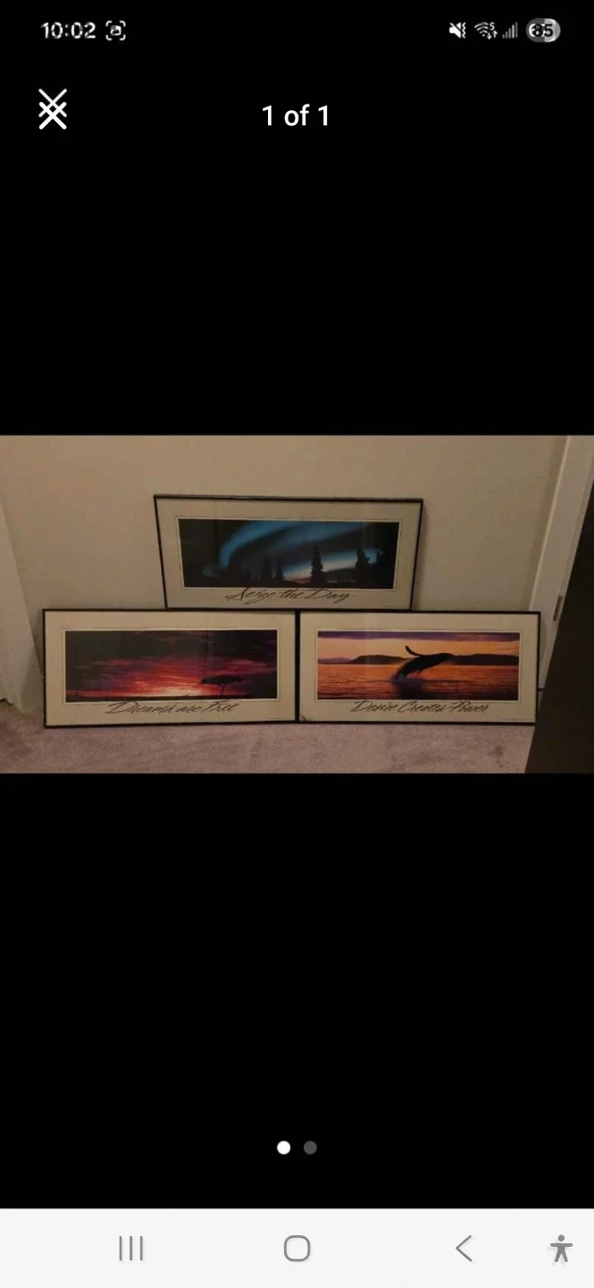 This set includes three framed art prints. The prints depict natural scenes with inspirational quotes. One print shows the aurora borealis with the text 'Seize the Day'. Another displays a sunset over a savanna with 'Dreams are that'. The third features a whale breaching during sunset with 'Desire Created Power'.