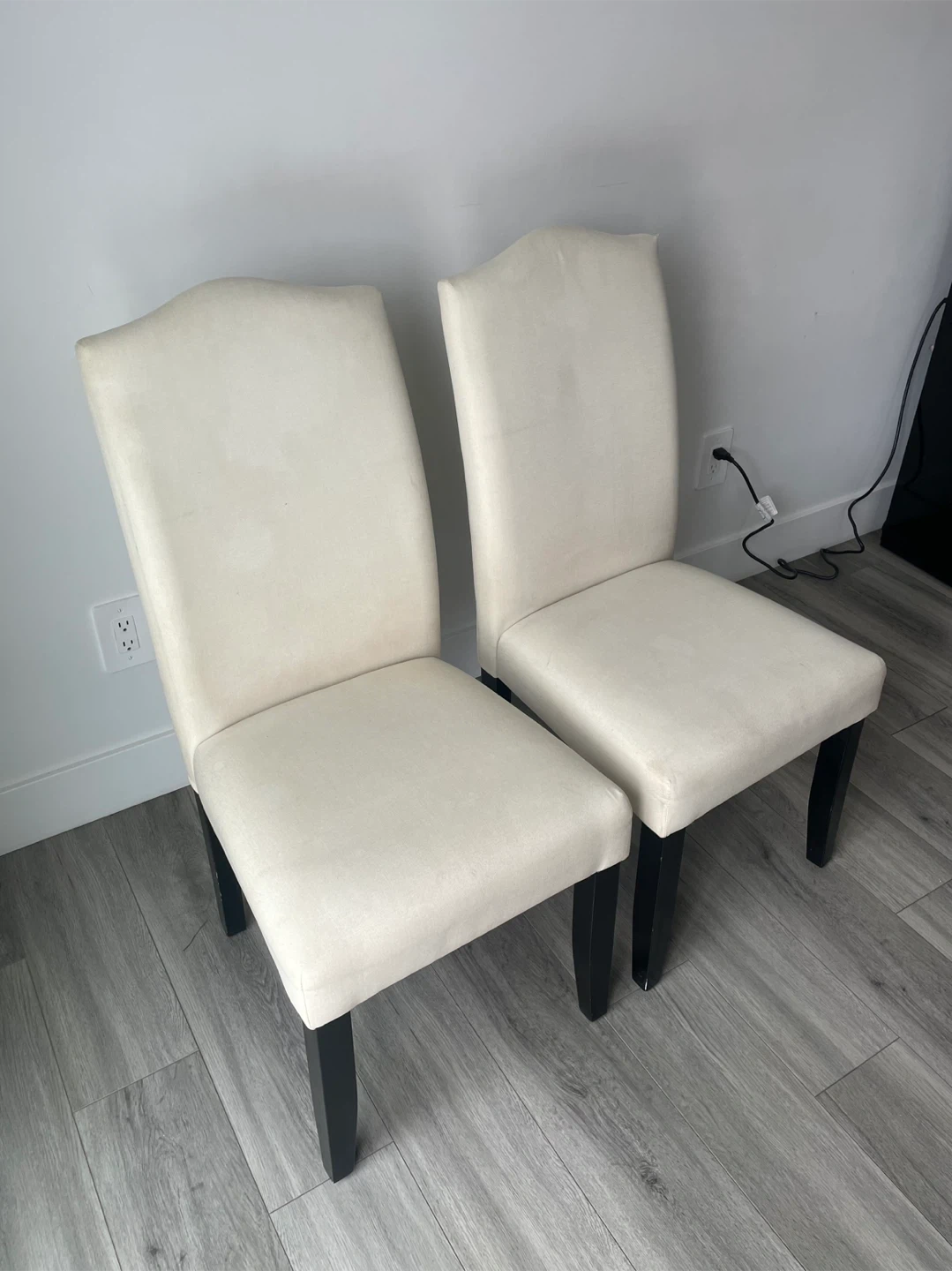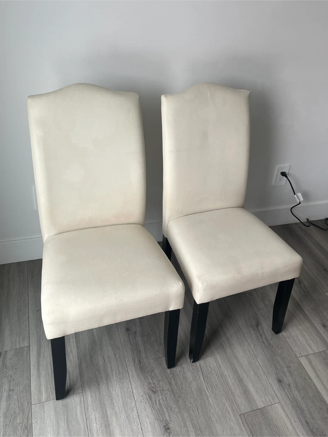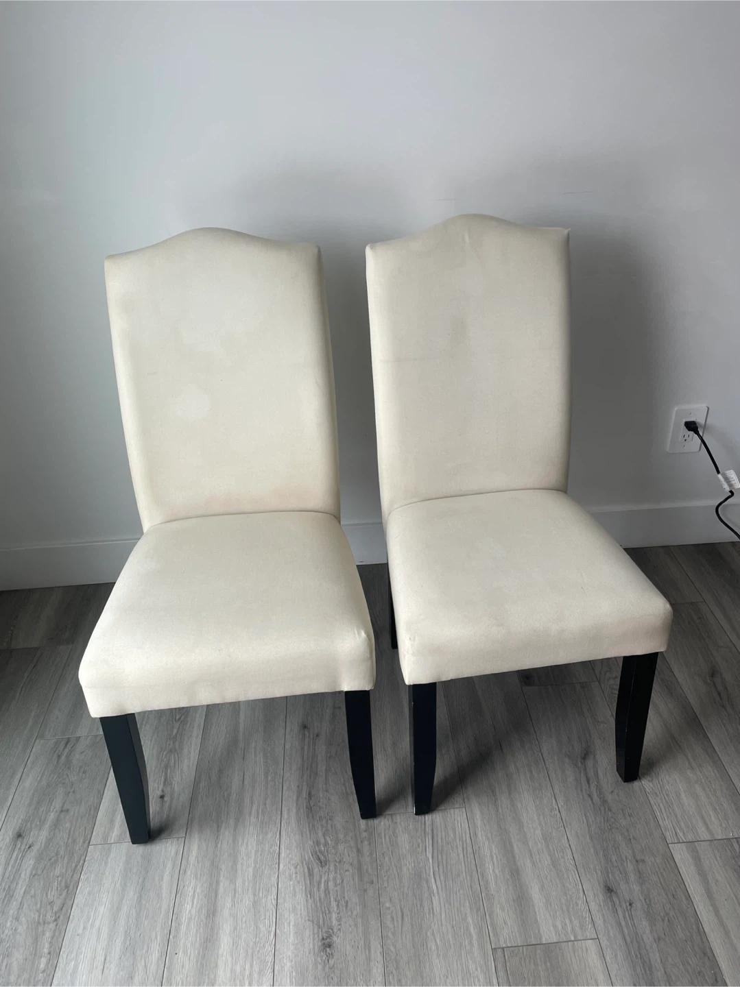 ($30 For Both) Two Dining Chairs. Cream Color with Dark Wooden Legs, In Okay Condition Has Wear As Shown In The Pictures.