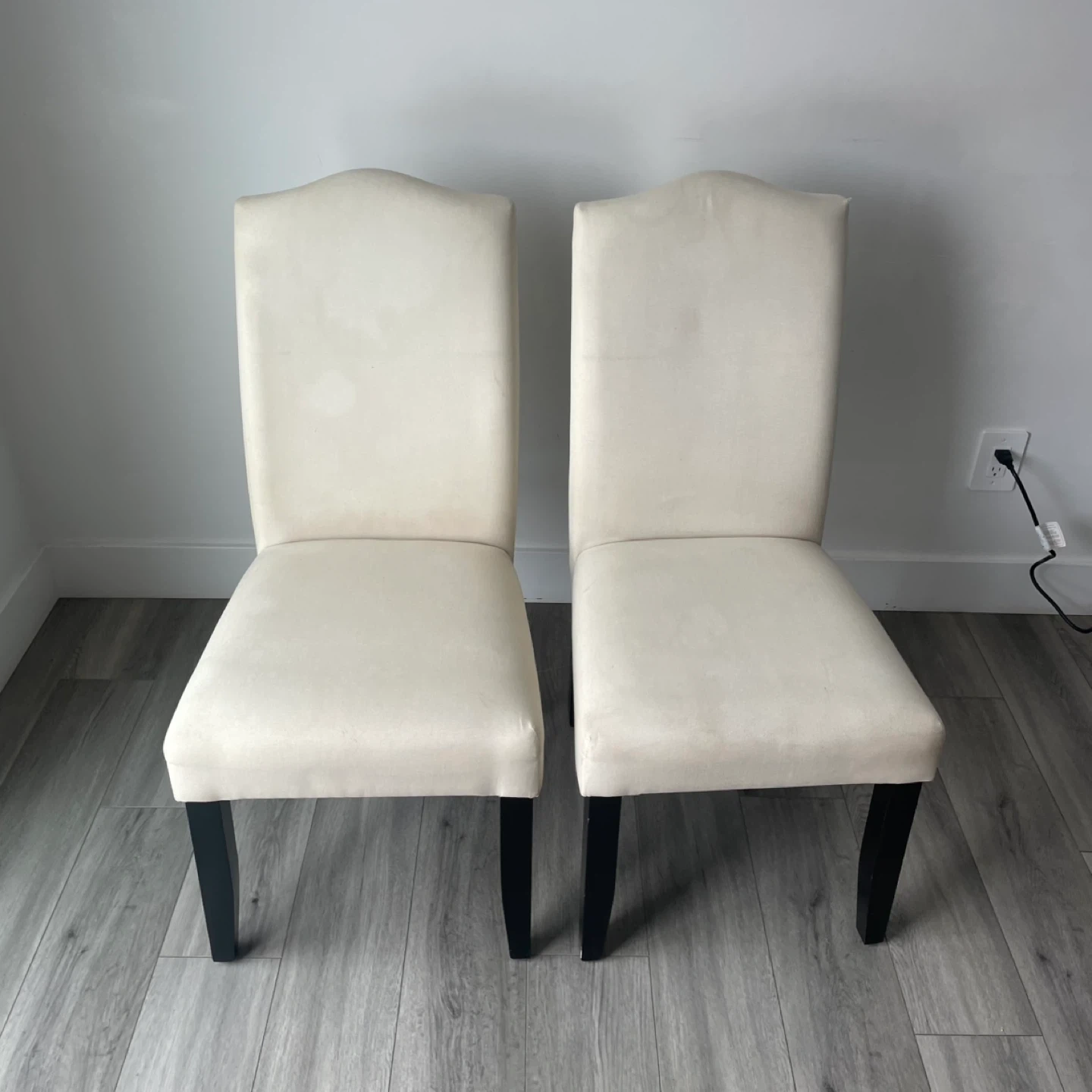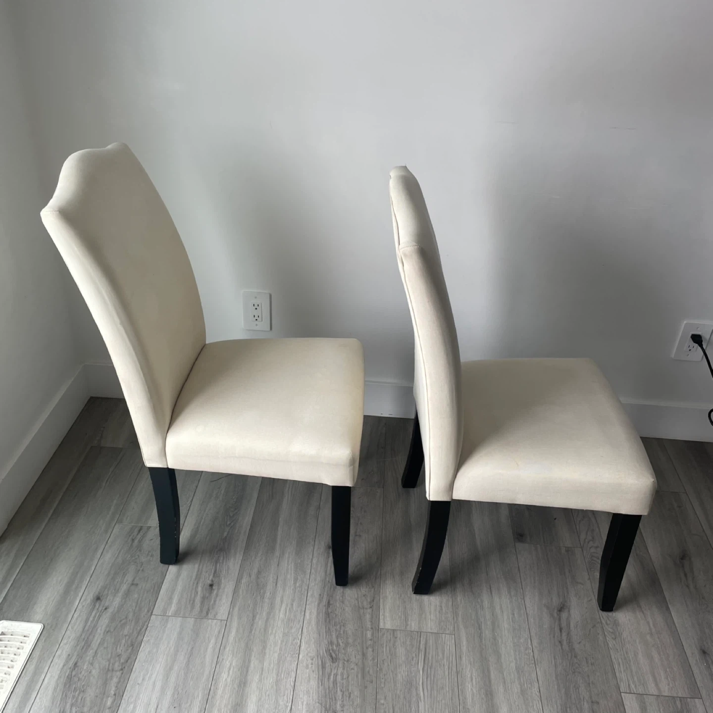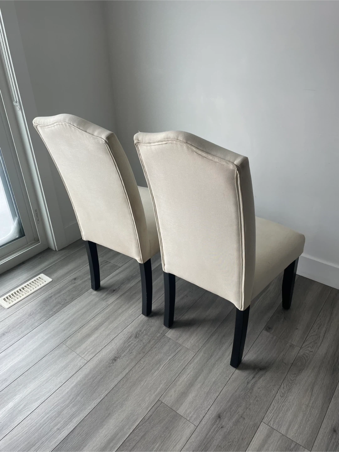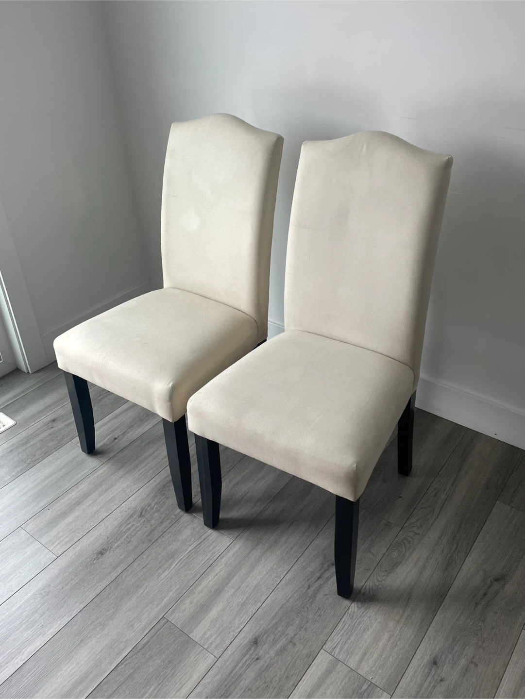 ($30 For Both) Two Dining Chairs. Cream Color with Dark Wooden Legs, In Okay Condition Has Wear As Shown In The Pictures.