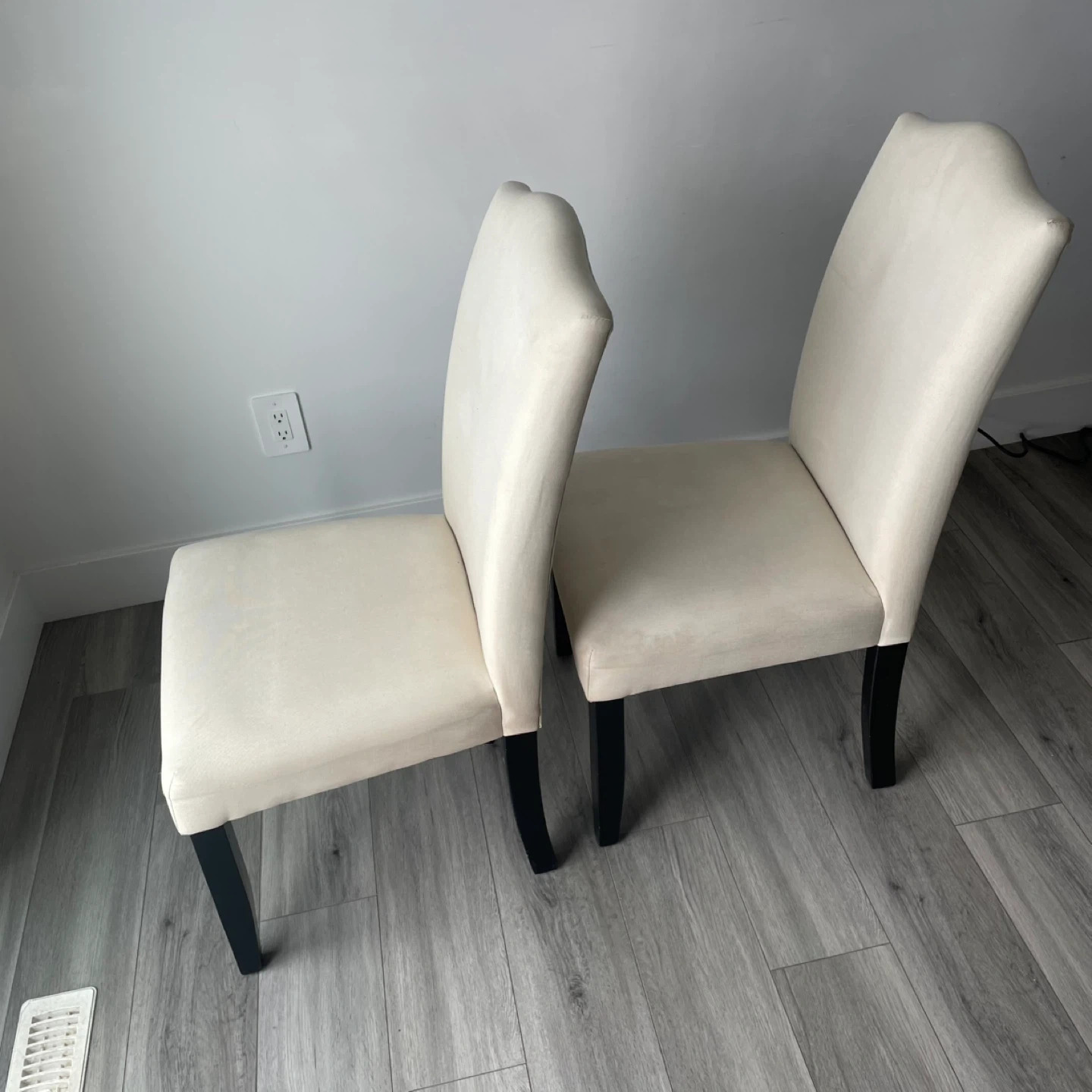 ($30 For Both) Two Dining Chairs. Cream Color with Dark Wooden Legs, In Okay Condition Has Wear As Shown In The Pictures.