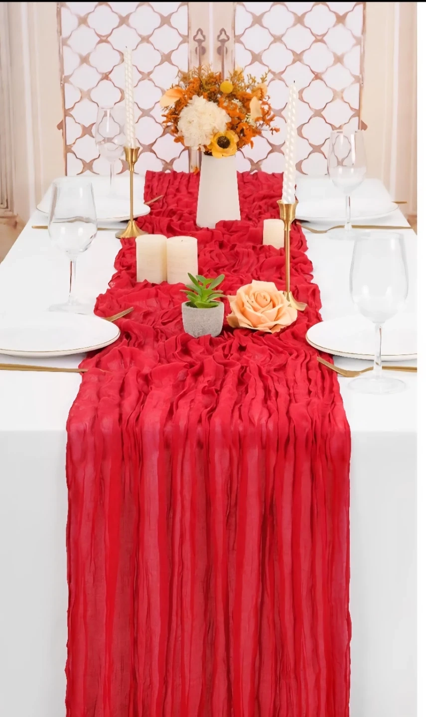 This gorgeous crinkle cheesecloth table runner comes in a vibrant red colour. It's perfect for dressing up your dining table for special occasions or everyday elegance. It creates a lovely ruffled effect when draped.