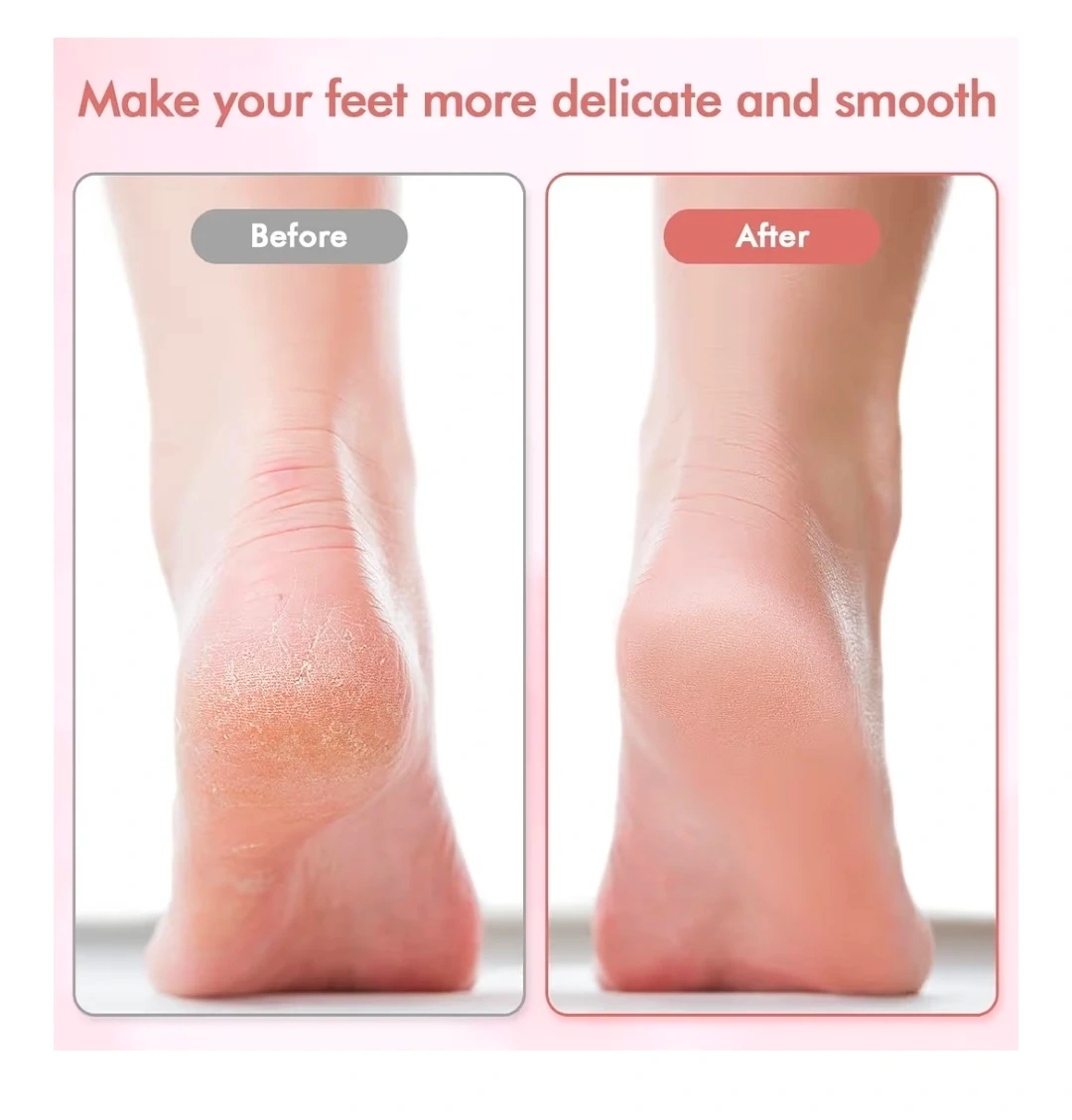 Electric foot grinder, model SF-5001. Comes with two roller heads: a fine one for daily maintenance and a coarse one for removing calluses. USB rechargeable with a safety foot guard. Net weight is 124g.