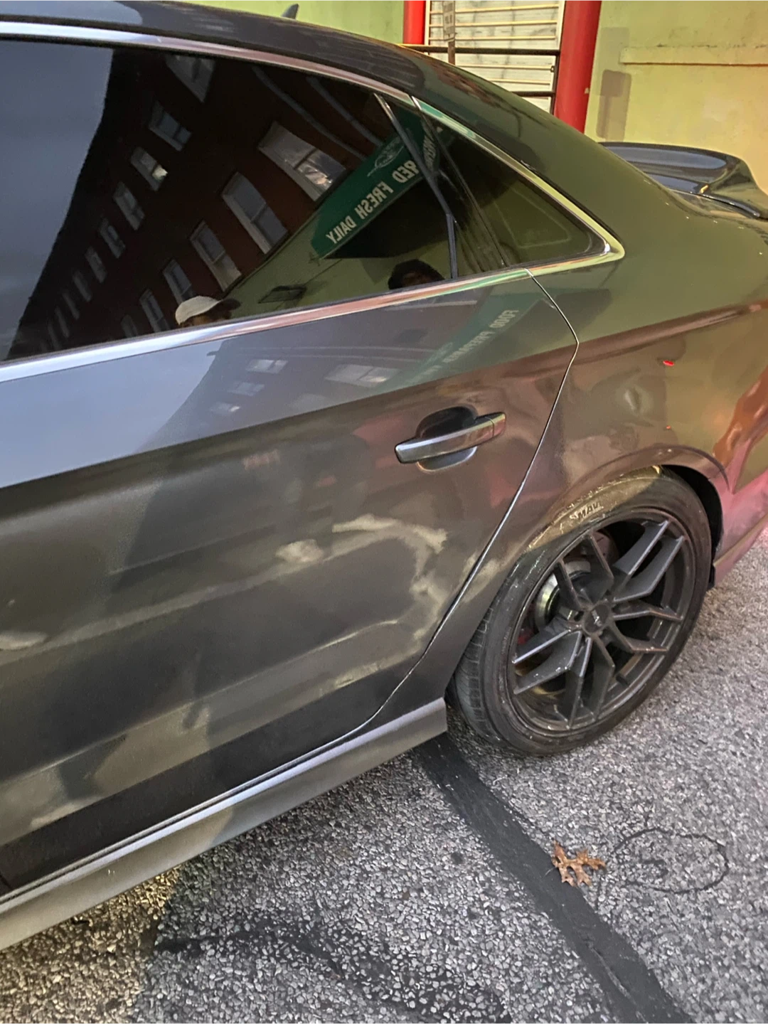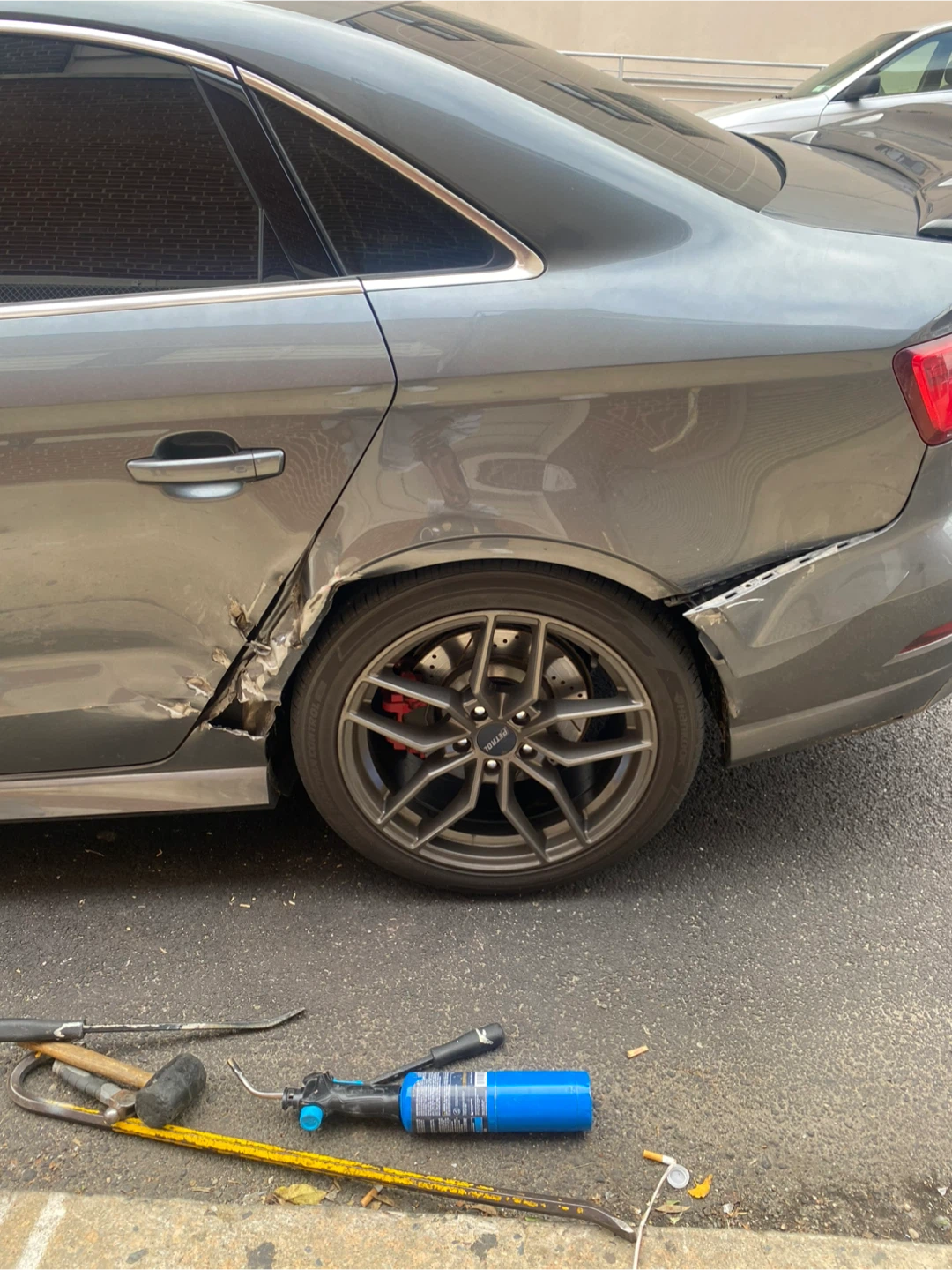 This is the rear passenger side fender and quarter panel of an Audi A3 S-Line. It has significant damage from an impact. The car's color is gray.
