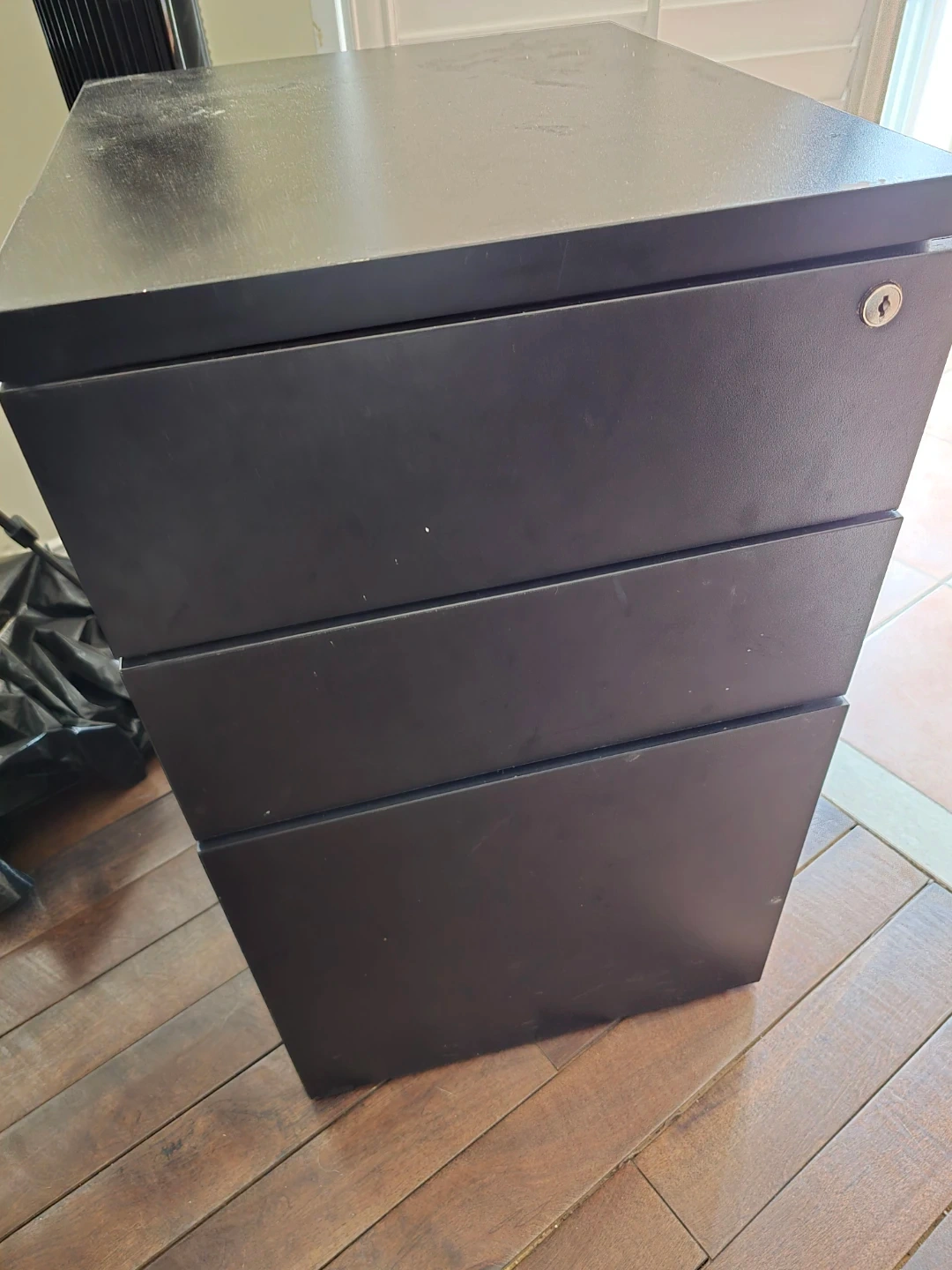 This black filing cabinet has three drawers for storage. It's a practical addition for any home office. Made of sturdy material for durability. Very heavy.