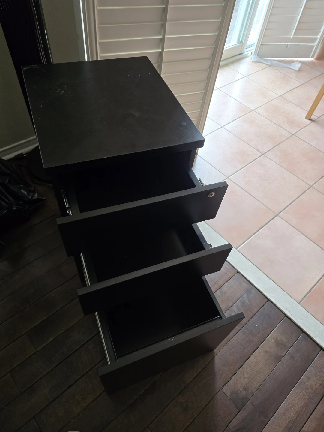 This black filing cabinet has three drawers for storage. It's a practical addition for any home office. Made of sturdy material for durability. Very heavy.