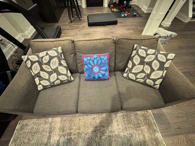 I'm selling a used three-seater couch with a grey fabric finish, perfect for a living room or recreational space. The couch comes with accent pillows, adding a touch of style and comfort. This cozy couch is ready to find a new home!