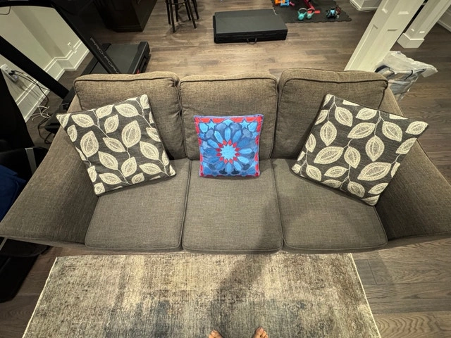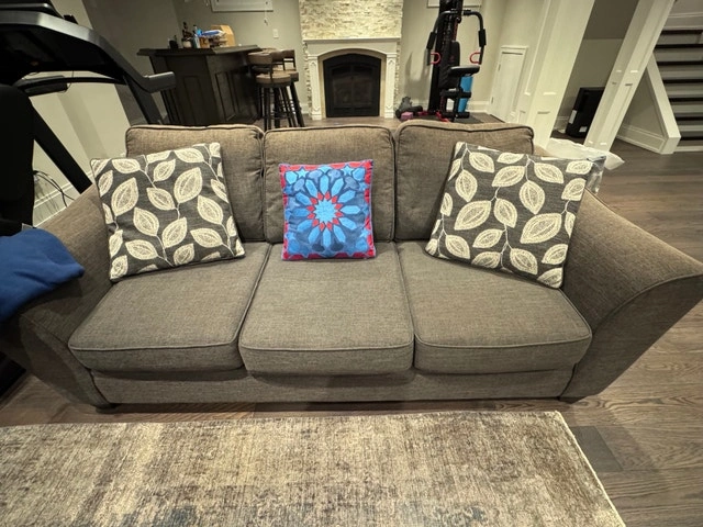 I'm selling a used three-seater couch with a grey fabric finish, perfect for a living room or recreational space. The couch comes with accent pillows, adding a touch of style and comfort. This cozy couch is ready to find a new home!
