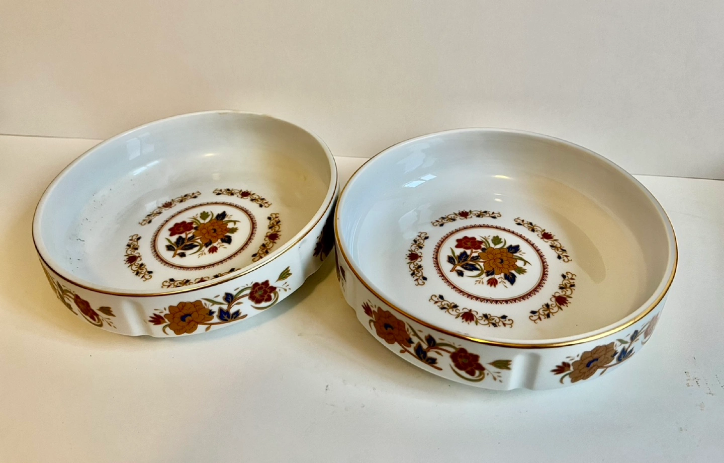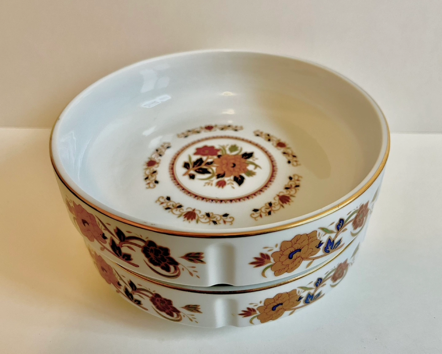 Pair of porcelain bowls. 6.5” diameter, 1.5” deep. Floral design with gold trim. Stackable. Excellent condition. Perfect for decorative or serving purposes. Listed price is for both items.