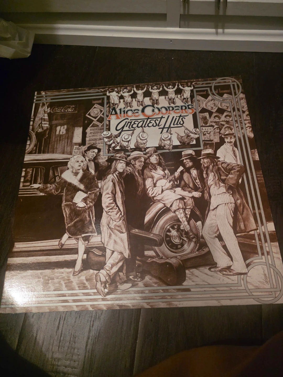 Alice Cooper's Greatest Hits vinyl record. Features classic tracks from the iconic artist. A must-have for any rock music collector!