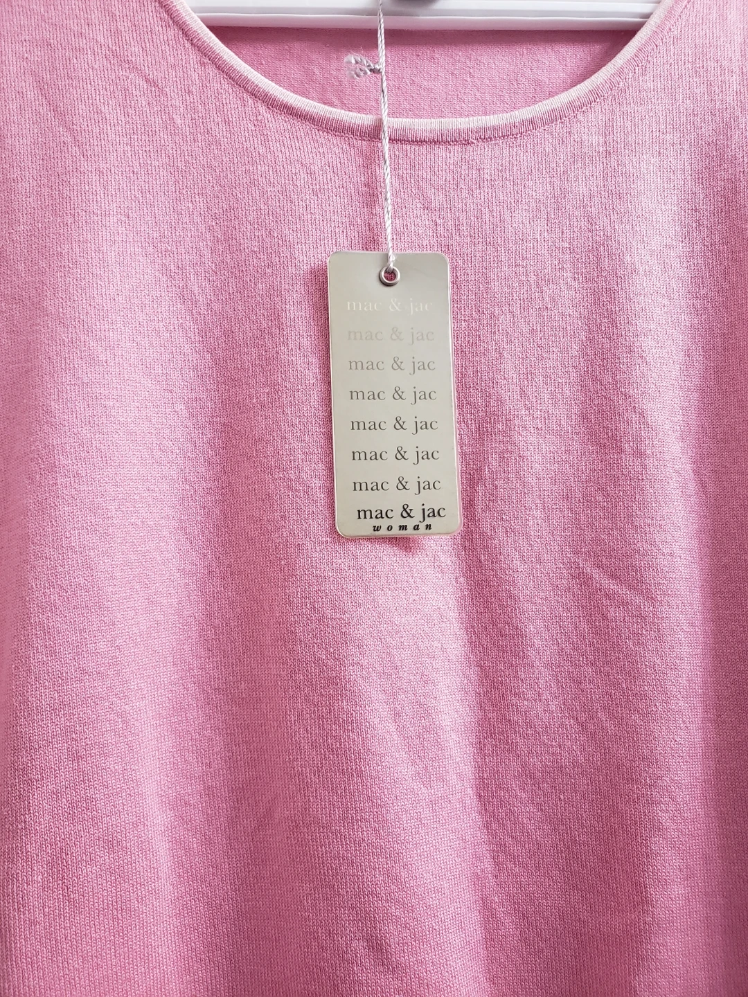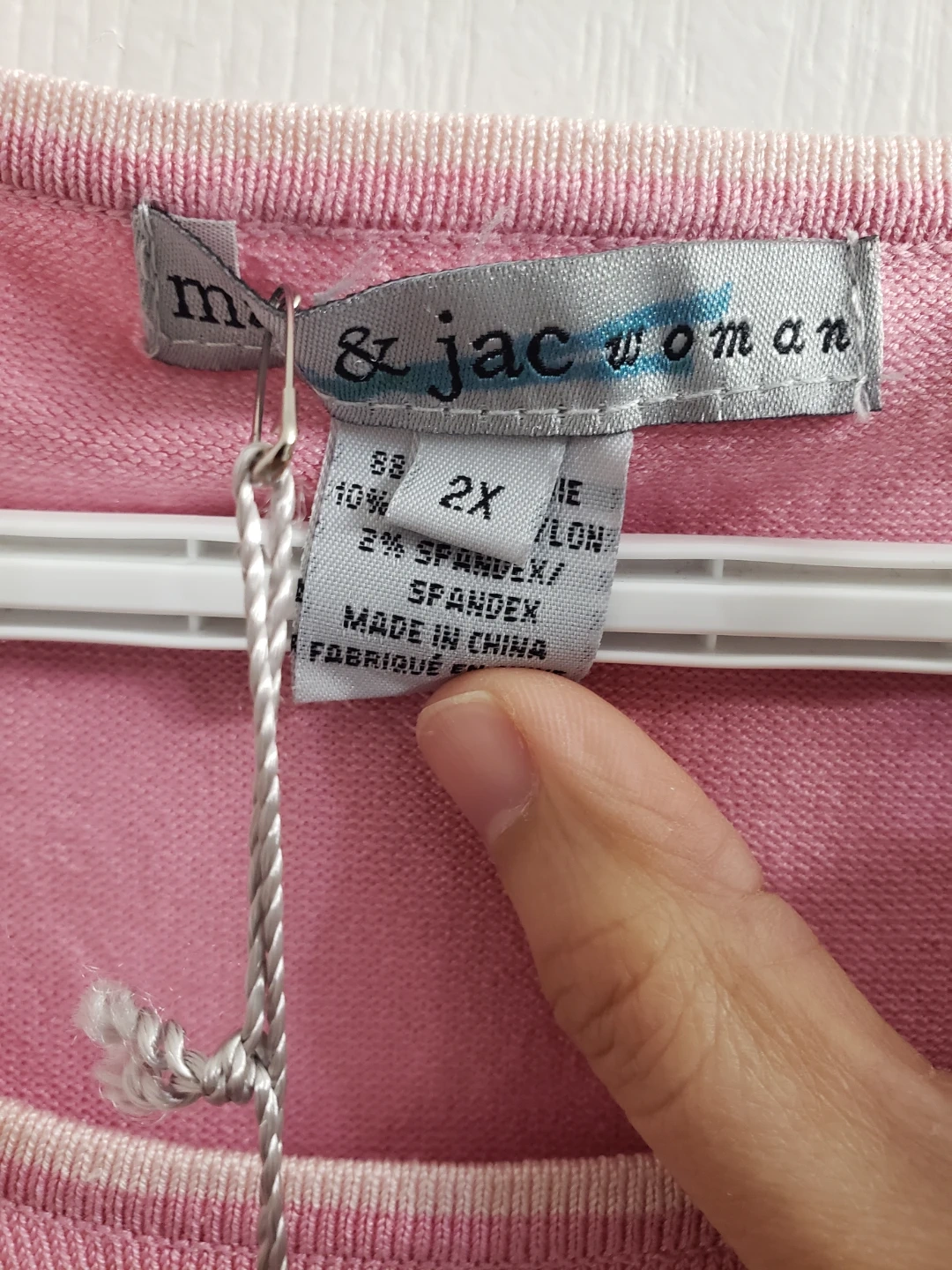 This Mac & Jac Woman sleeveless sweater vest is a lovely pink colour. It's a size 2X and made from a blend of 98% cotton and 2% spandex. It's a great layering piece for a casual look!