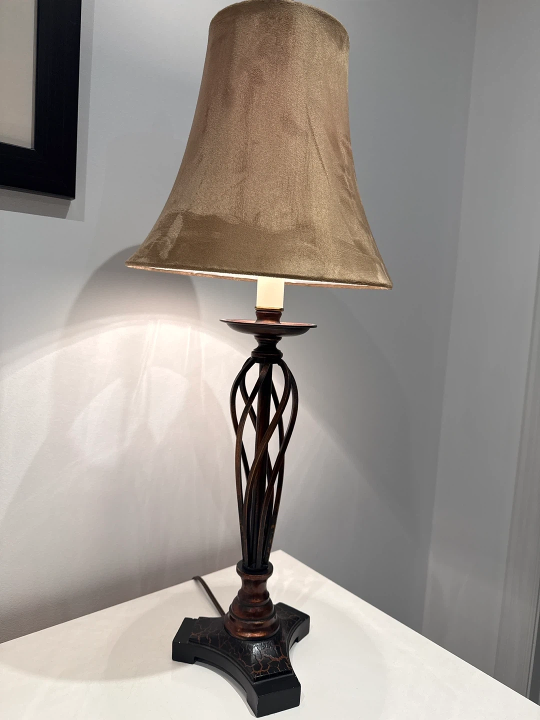 This table lamp features a unique twisted metal base with a decorative patterned black base. It comes with a classic bell-shaped fabric shade in a warm, neutral tone. It's perfect for adding a touch of ambient lighting to any room.