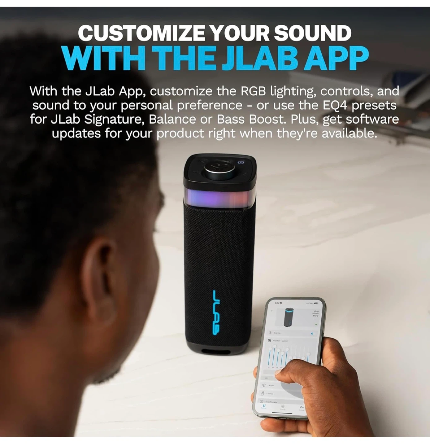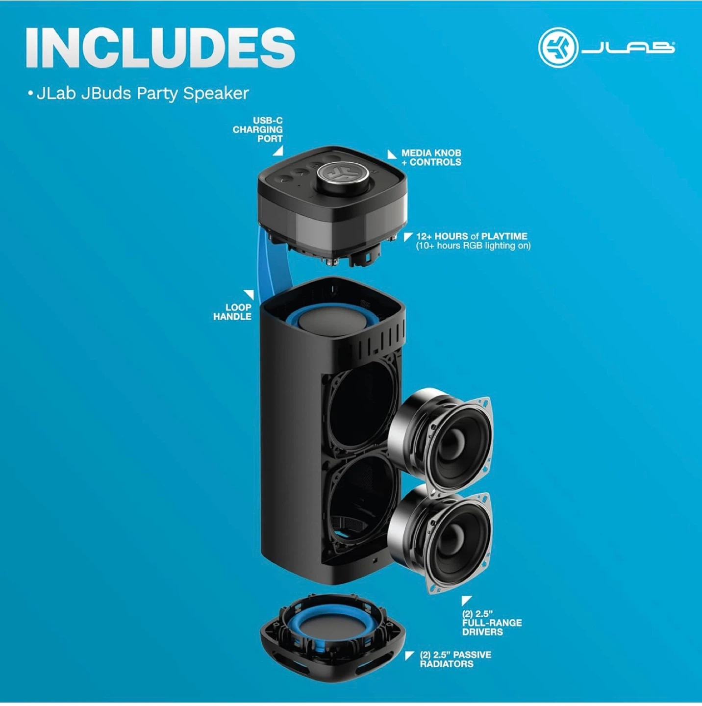 JLab JBuds Party Portable Bluetooth Speaker with dual 2.5" full-range drivers and dual passive radiators. It's IP56 waterproof rated and offers 12 hours of playtime with 10+ hours of RGB lighting. Connect multiple speakers for an enhanced audio experience.