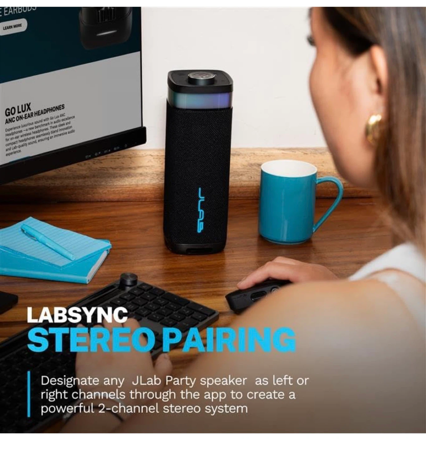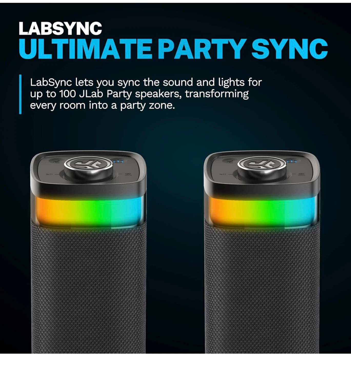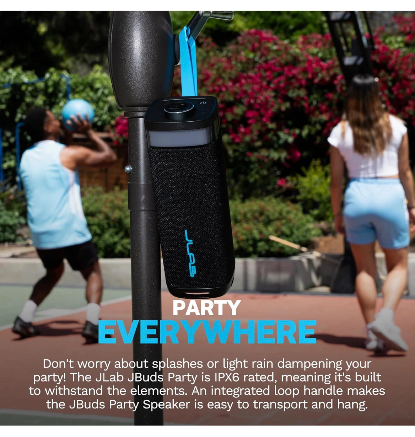 JLab JBuds Party Portable Bluetooth Speaker with dual 2.5" full-range drivers and dual passive radiators. It's IP56 waterproof rated and offers 12 hours of playtime with 10+ hours of RGB lighting. Connect multiple speakers for an enhanced audio experience.
