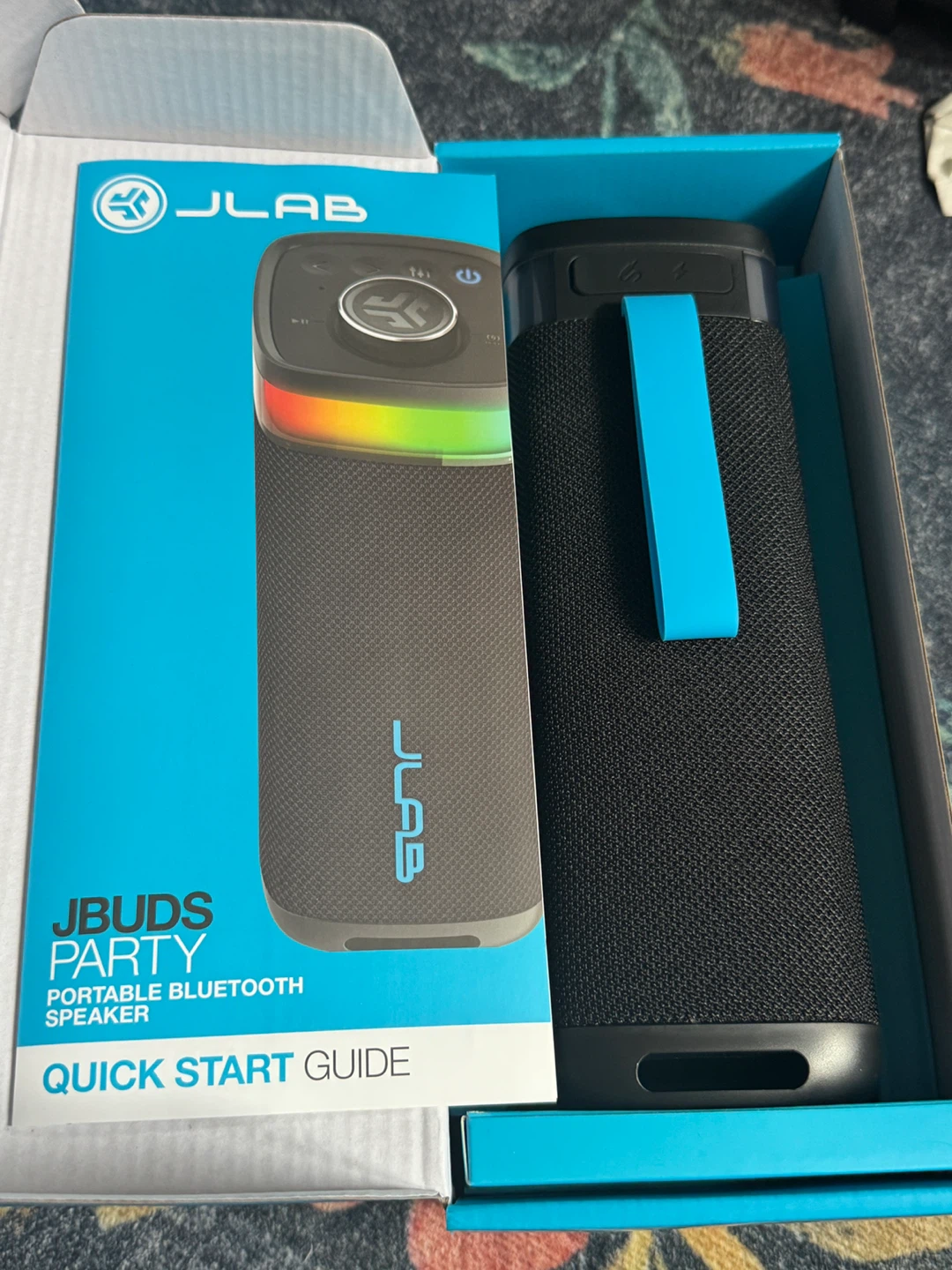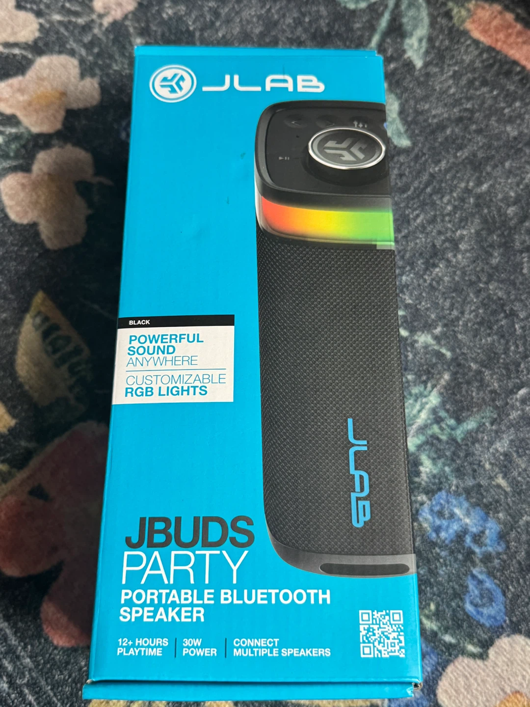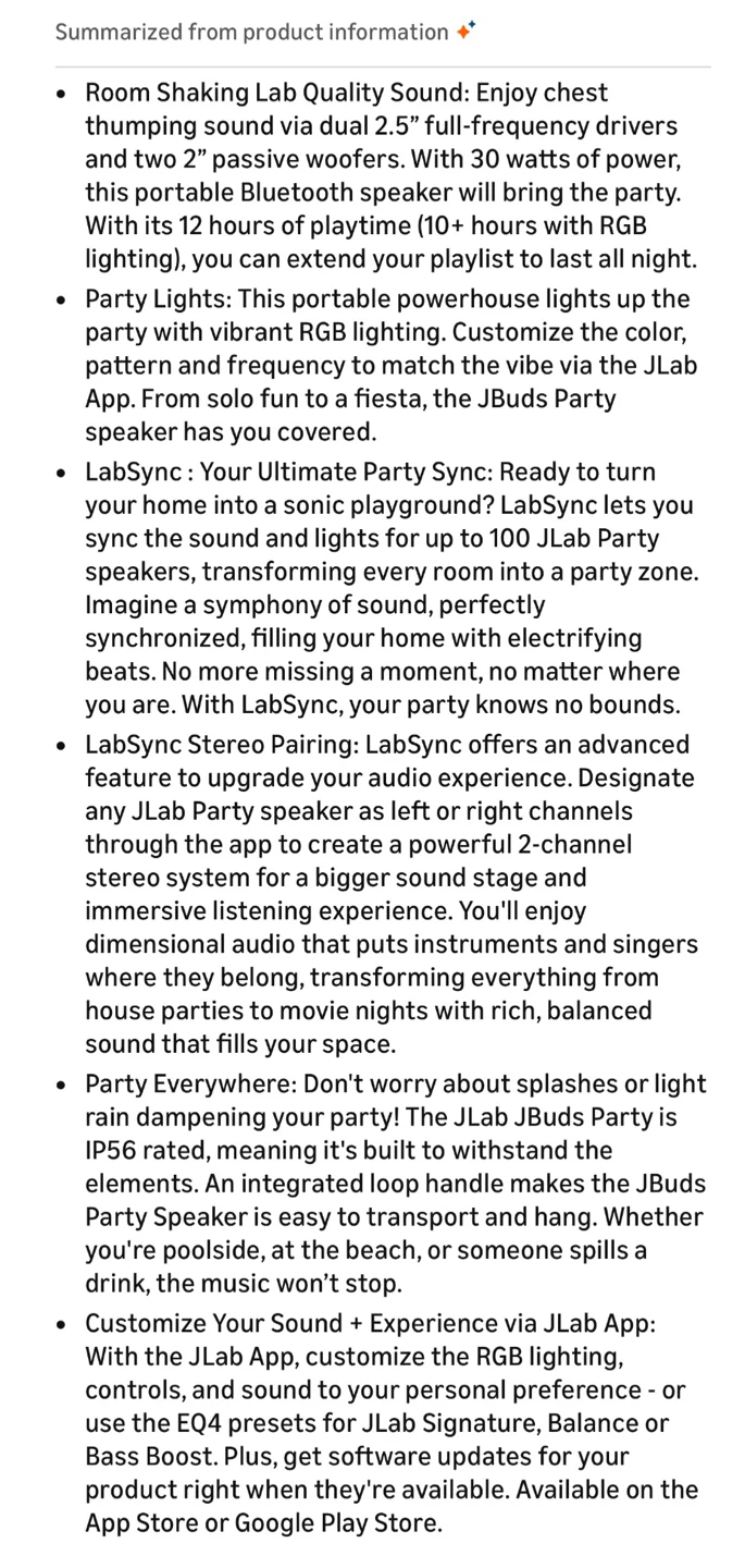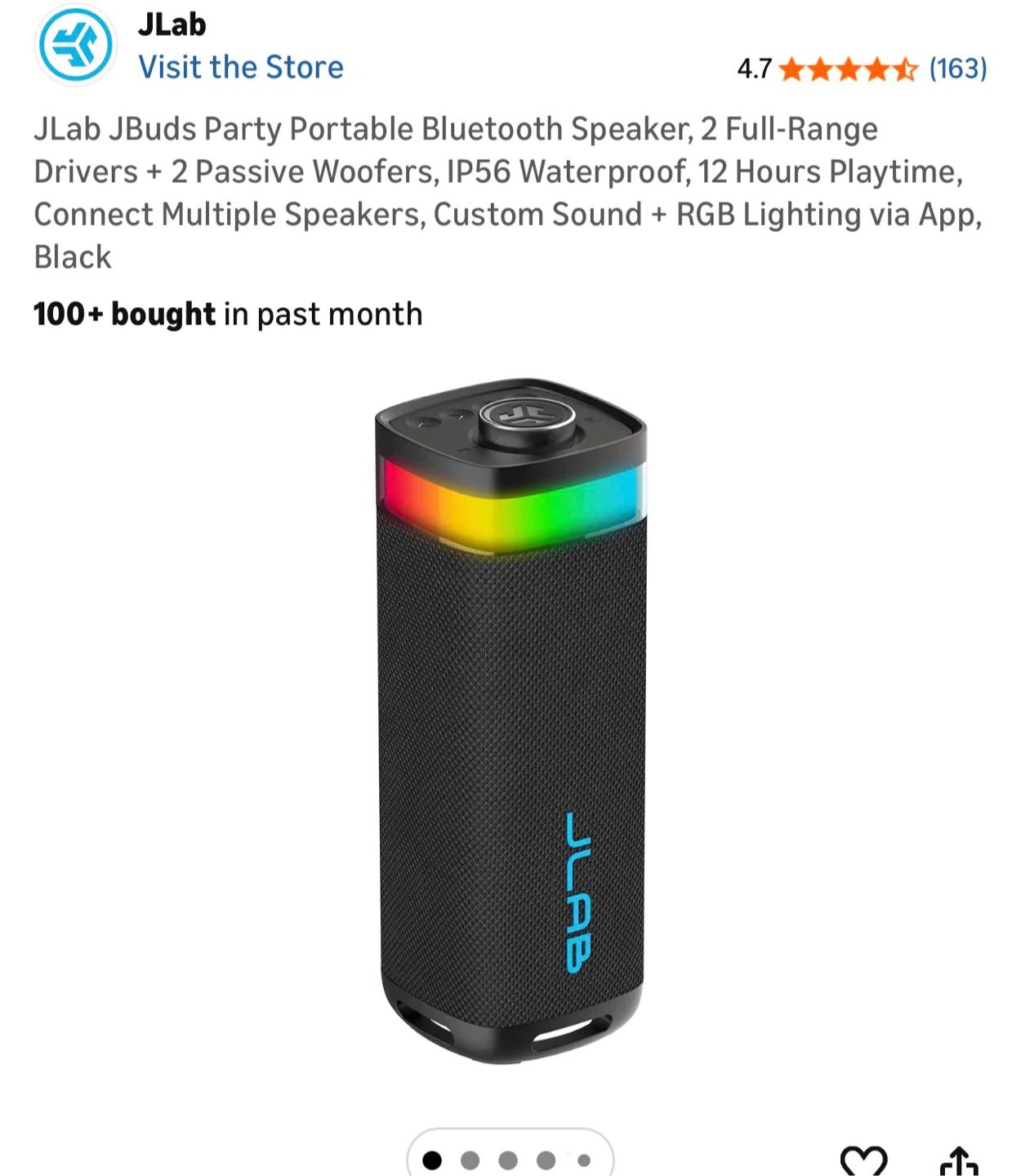 JLab JBuds Party Portable Bluetooth Speaker with dual 2.5" full-range drivers and dual passive radiators. It's IP56 waterproof rated and offers 12 hours of playtime with 10+ hours of RGB lighting. Connect multiple speakers for an enhanced audio experience.