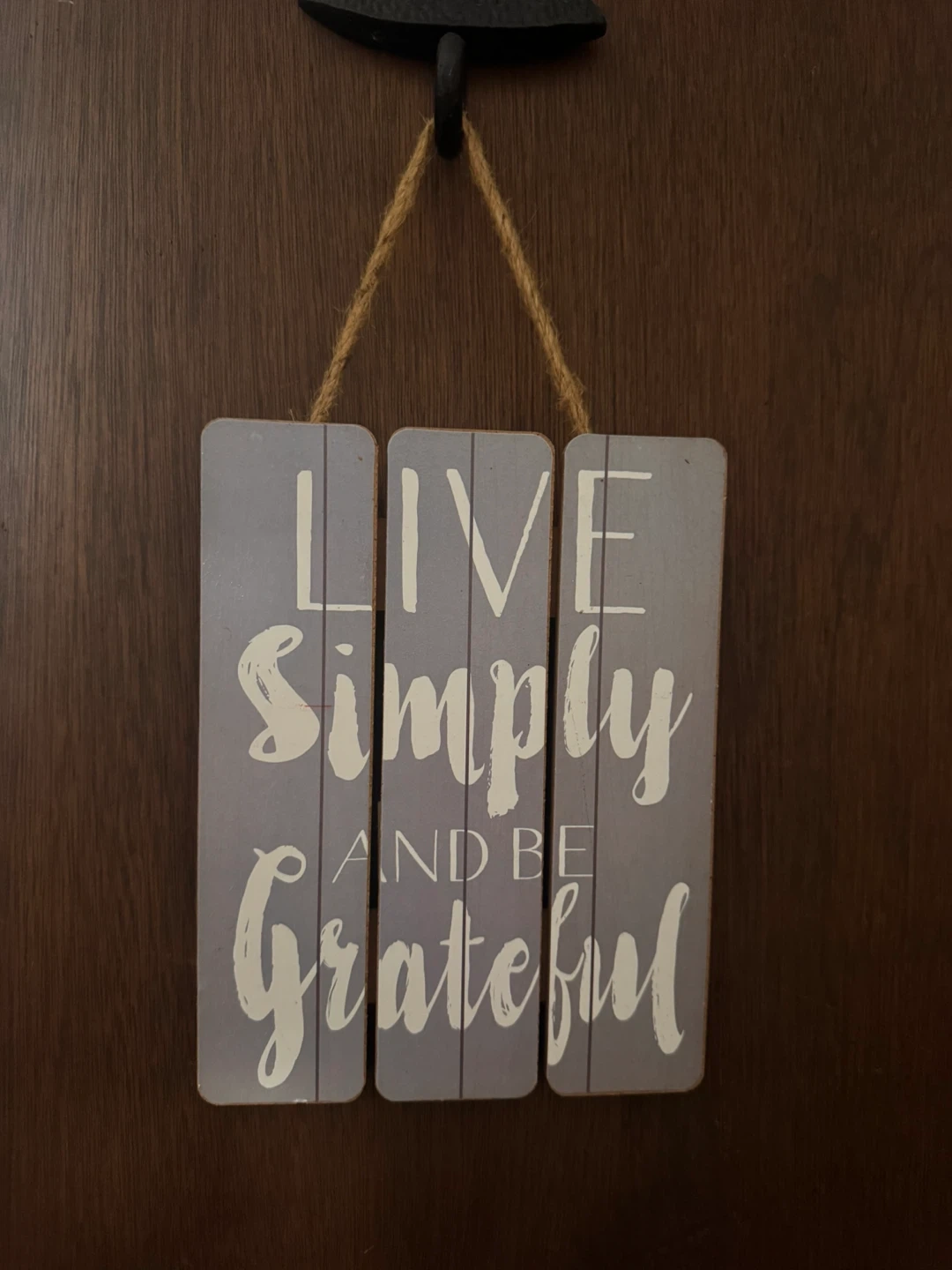 This decorative wooden sign features the inspirational phrase "Live Simply AND BE Grateful." It's constructed from multiple wood panels, giving it a rustic look. The sign hangs from a jute rope and is ready to display.