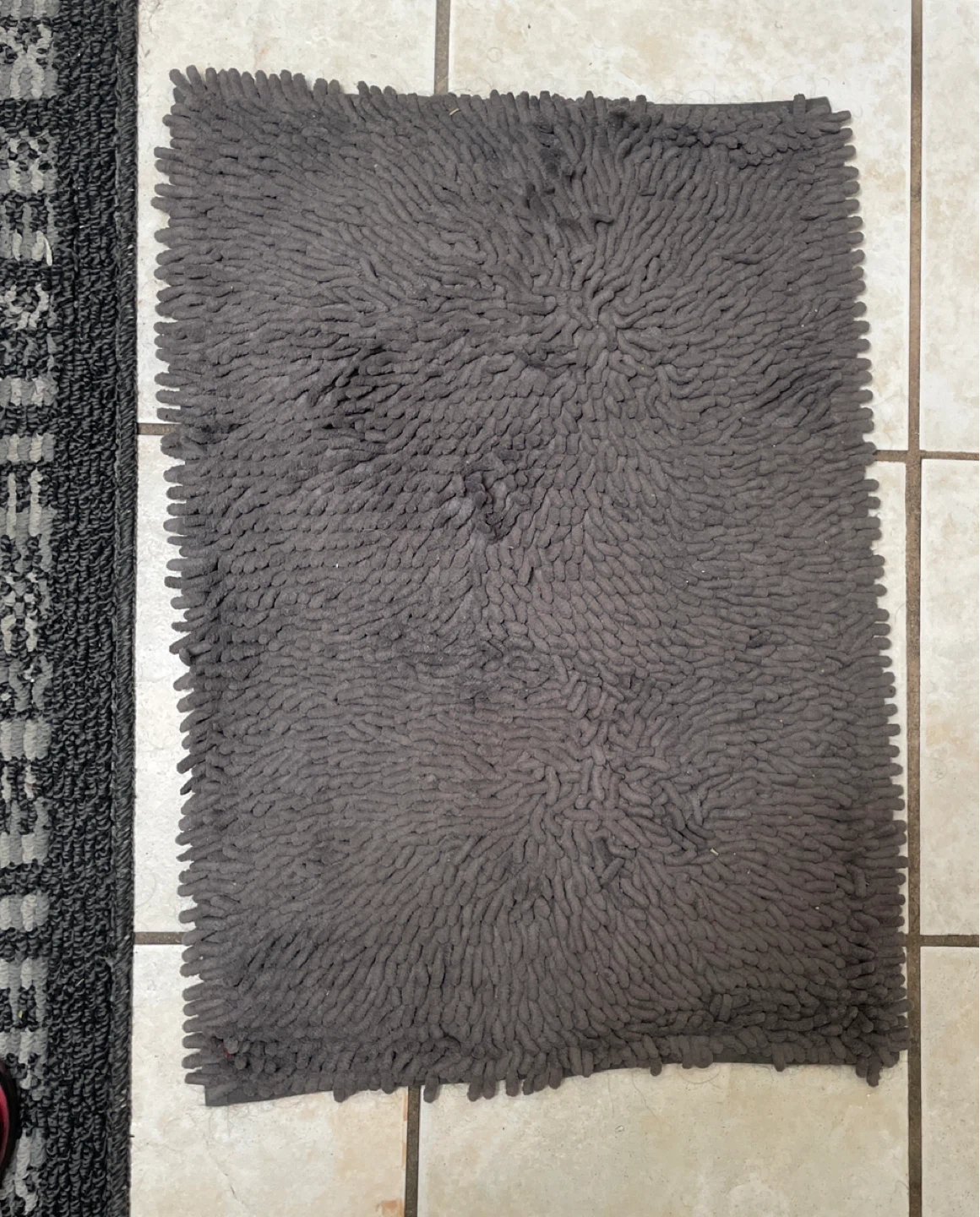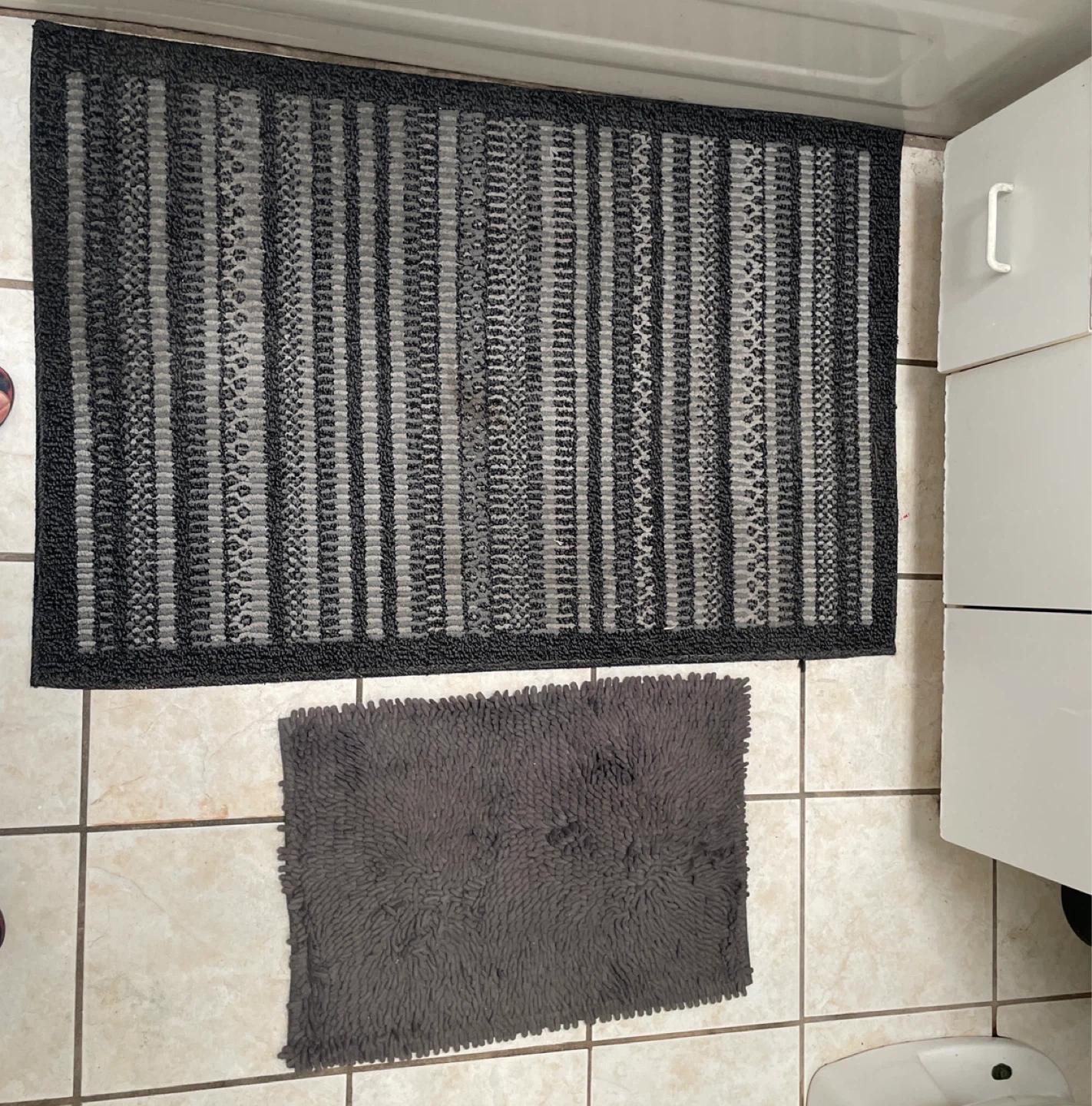 Two grey bath mats. One features a shaggy chenille design, while the other has a striped pattern.