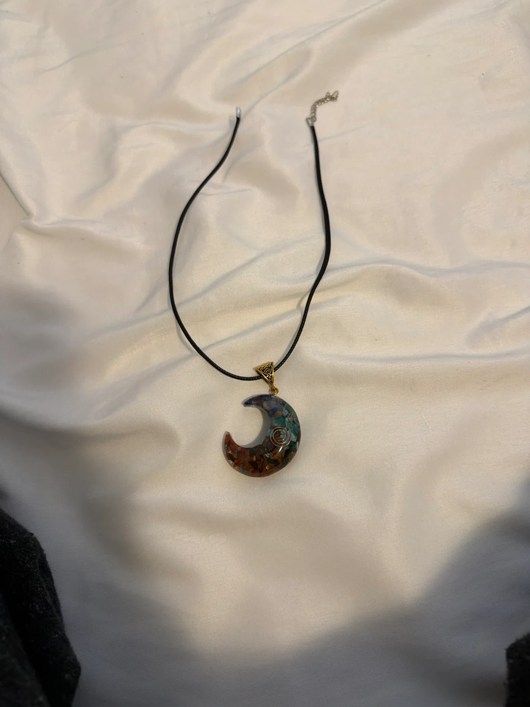 This necklace features a crescent moon pendant with colourful embedded stones. It has a black cord with an adjustable chain clasp.