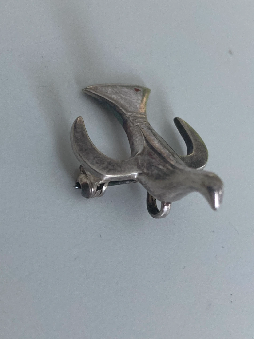 This is a silver-tone brooch in the shape of a bird. It has a secure pin backing. It's a nice accessory for clothing!