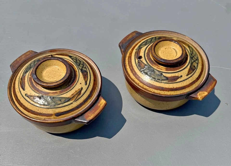 Earthy ceramic pots, set of two. Has cool brown and tan glaze with a fish-like pattern on the lids. Each pot has two small handles and a lid. Great for serving small dishes or just decor.