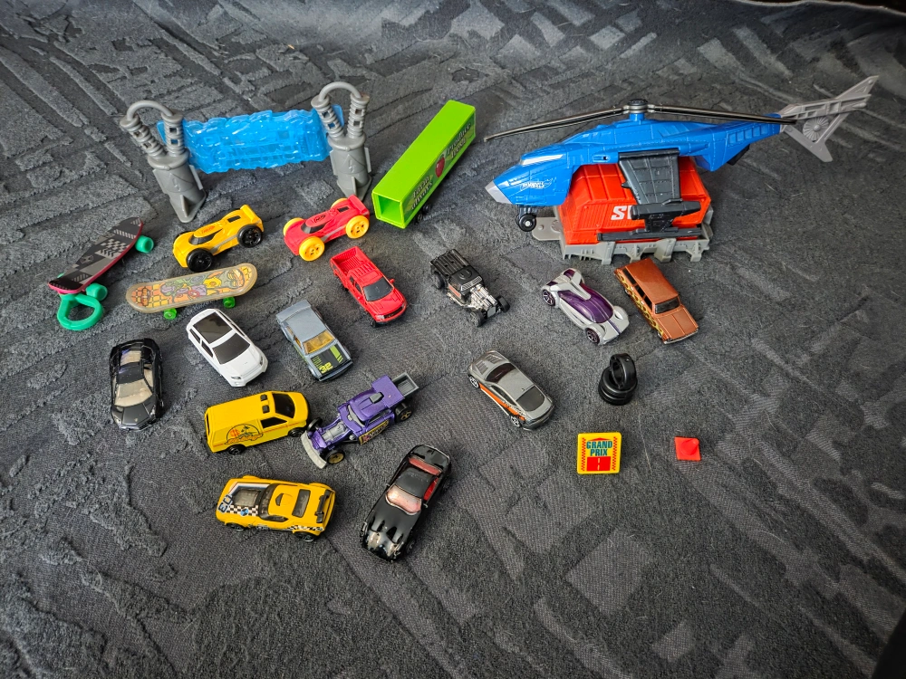 This playset includes multiple toy cars, skateboards, a helicopter with a trailer, and accessories. It features a variety of vehicles with different colours and designs. Perfect for imaginative play!