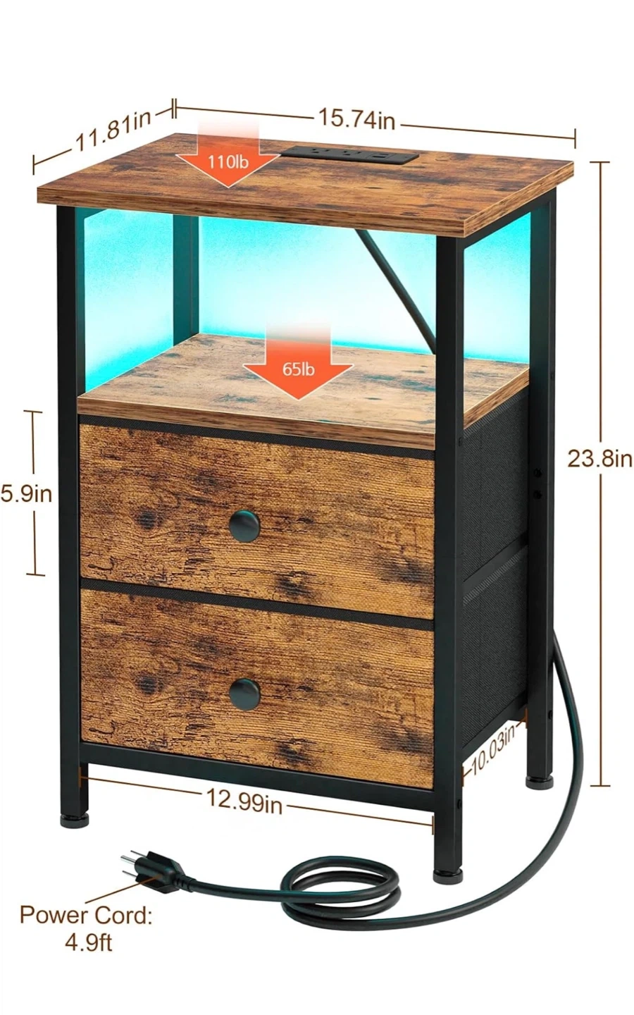 This nightstand features a rustic wood-grain top and two black fabric drawers for storage. It includes a built-in power strip with 2 AC outlets and a USB port. Its compact size makes it suitable for small spaces.