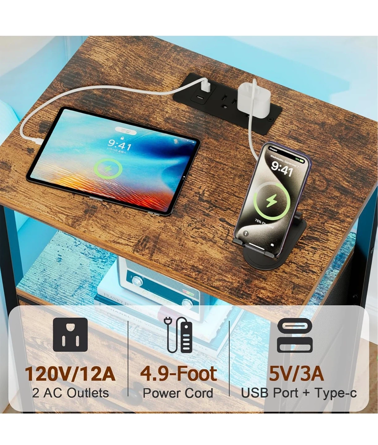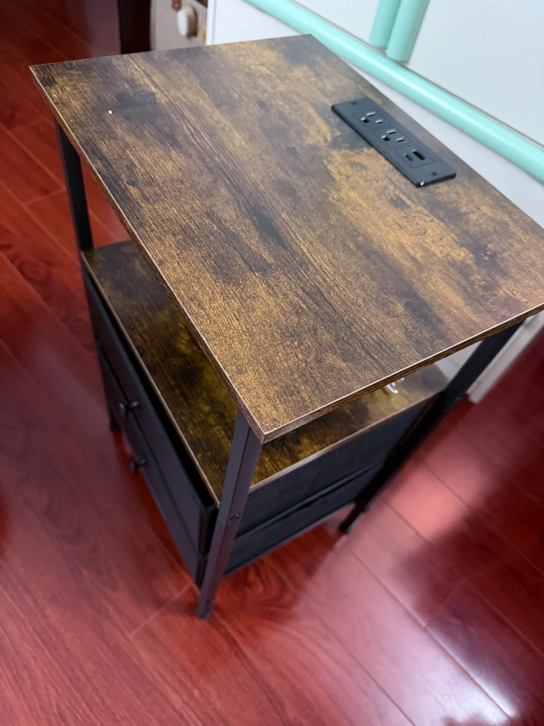This nightstand features a rustic wood-grain top and two black fabric drawers for storage. It includes a built-in power strip with 2 AC outlets and a USB port. Its compact size makes it suitable for small spaces.