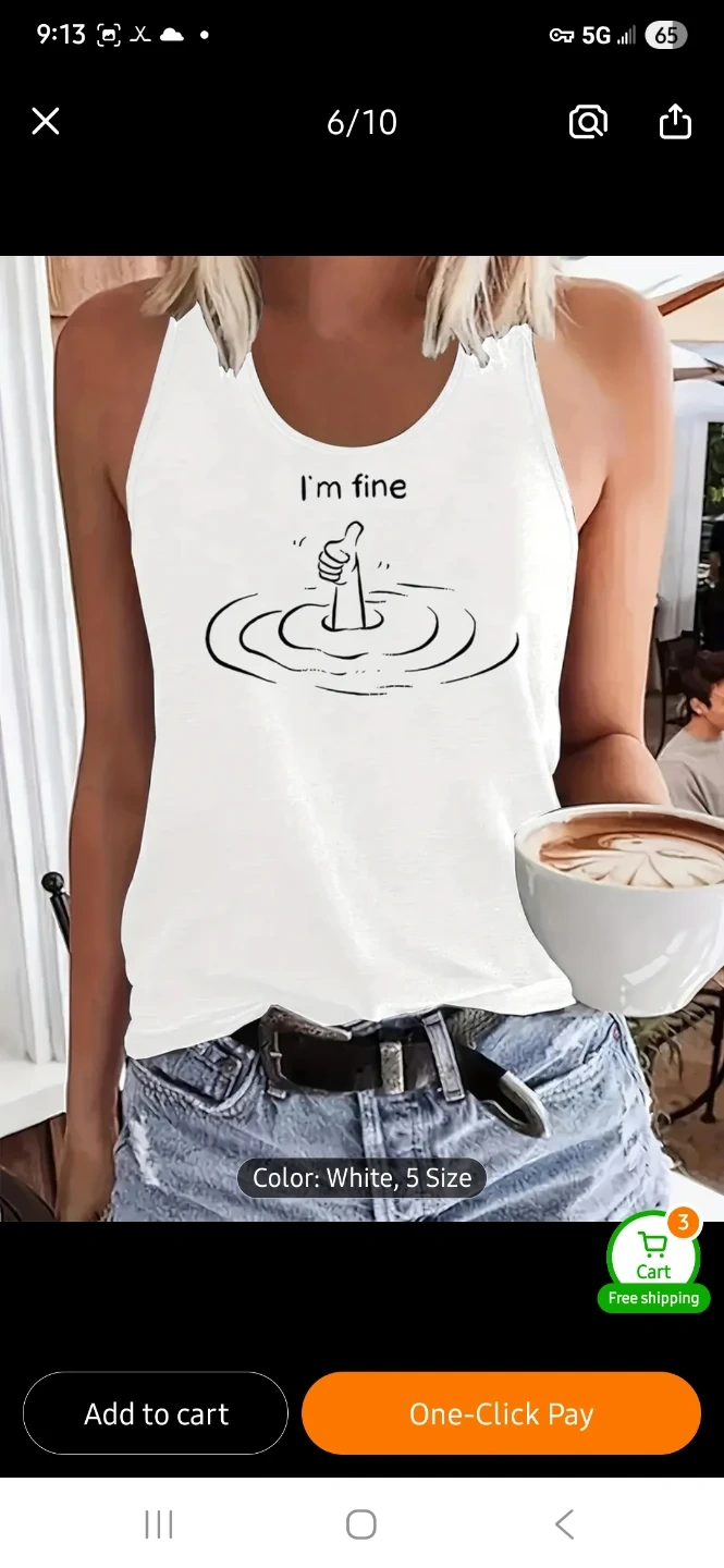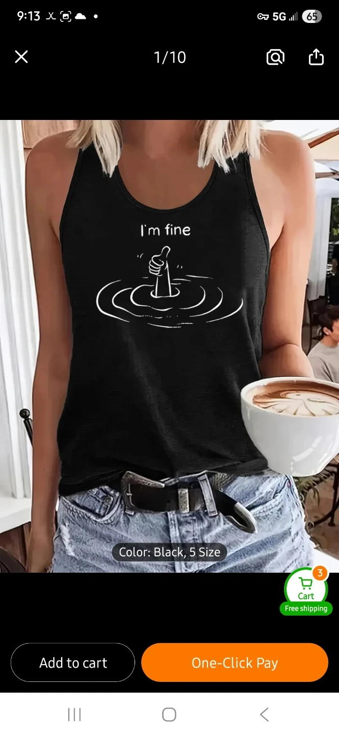 This tank top features a fun "I'm fine" graphic with a thumbs up. The material is comfortable for everyday wear. Comes in black or white.