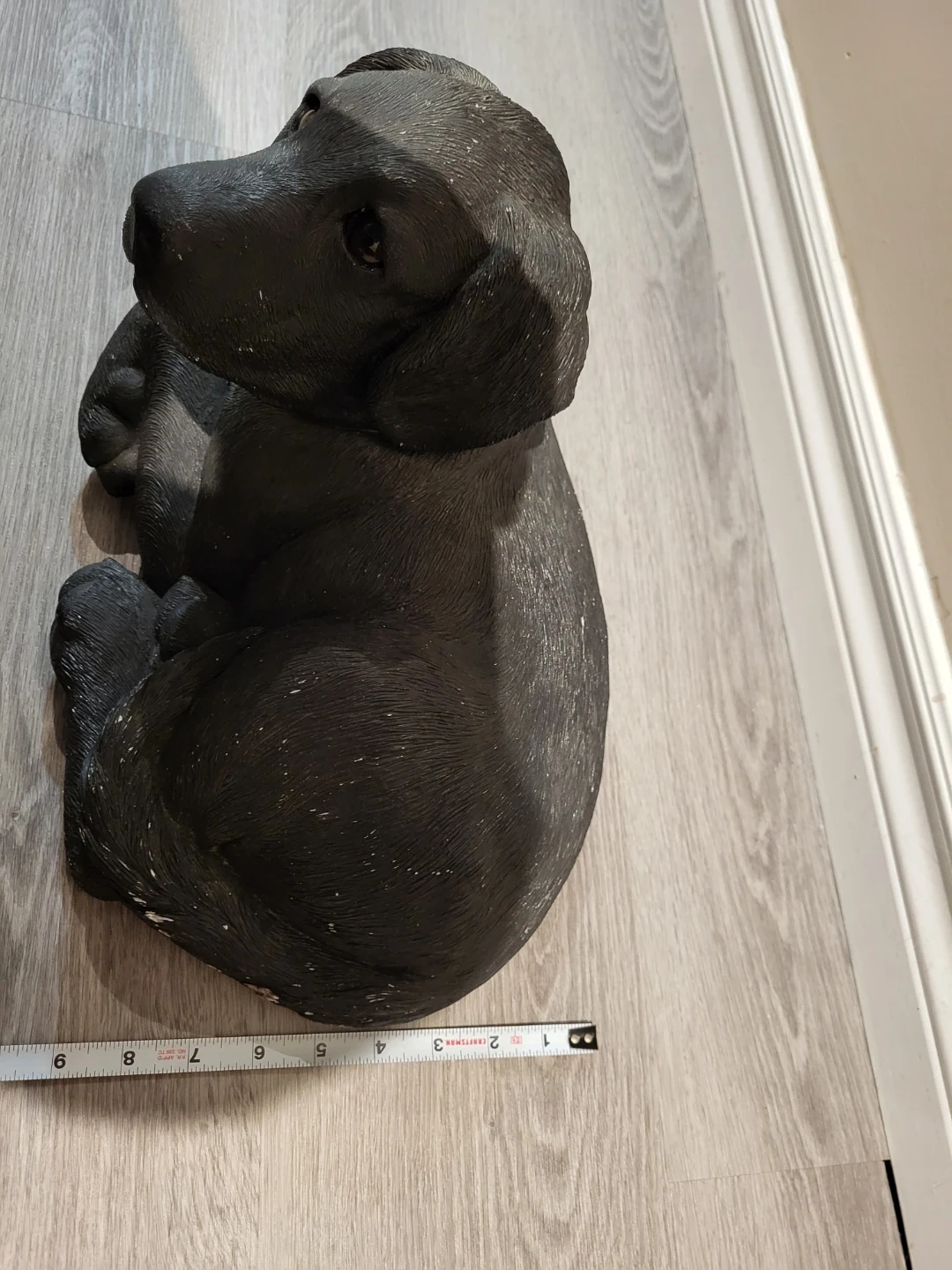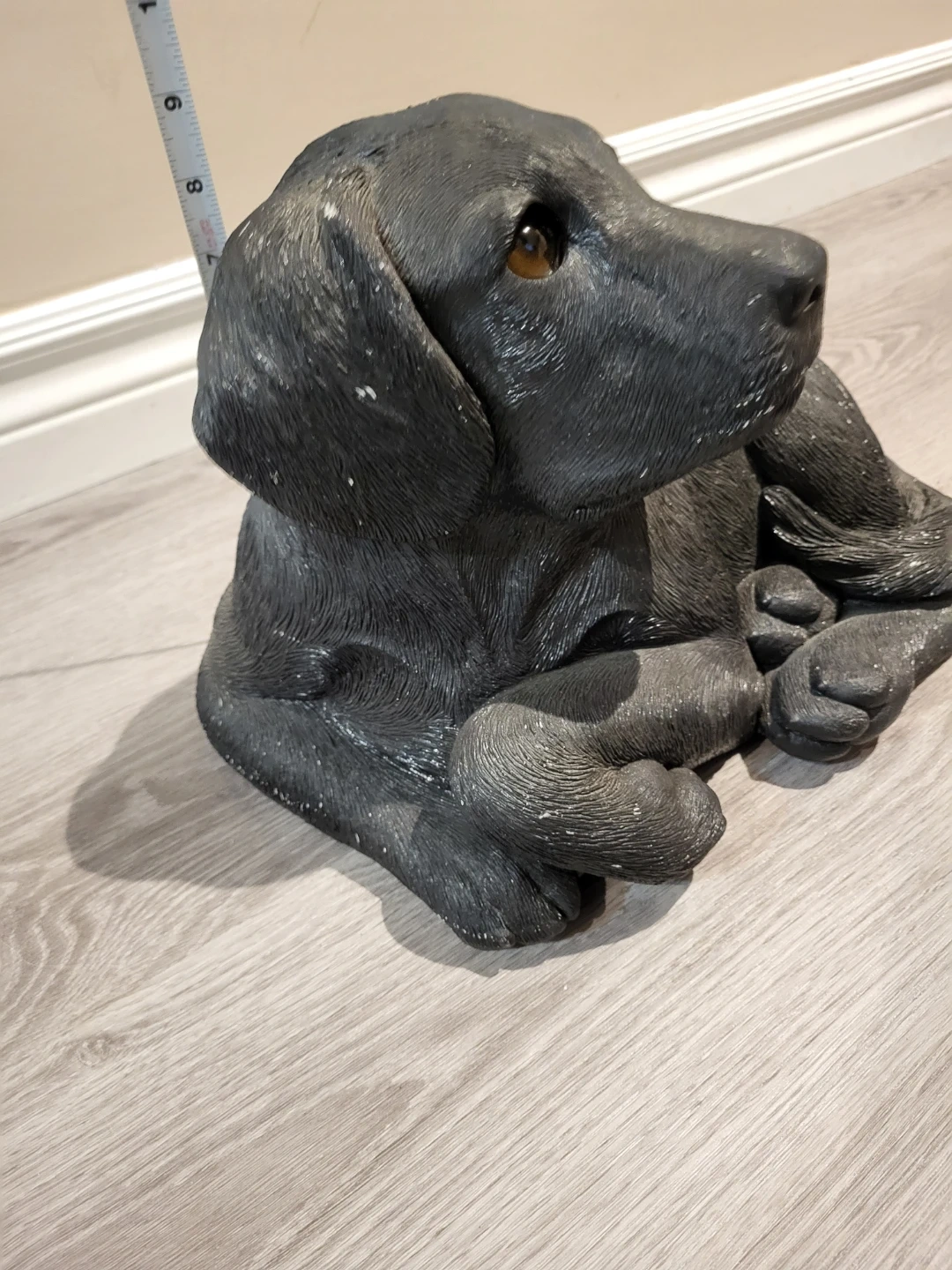 A cute black Lab figurine, perfect for display. Looks to be make of concrete and has realistic glass eyes.
