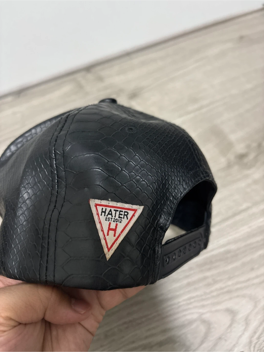 This is a black snapback cap from Hater. It's made with faux leather and features a textured snakeskin design. The cap has an adjustable strap at the back.