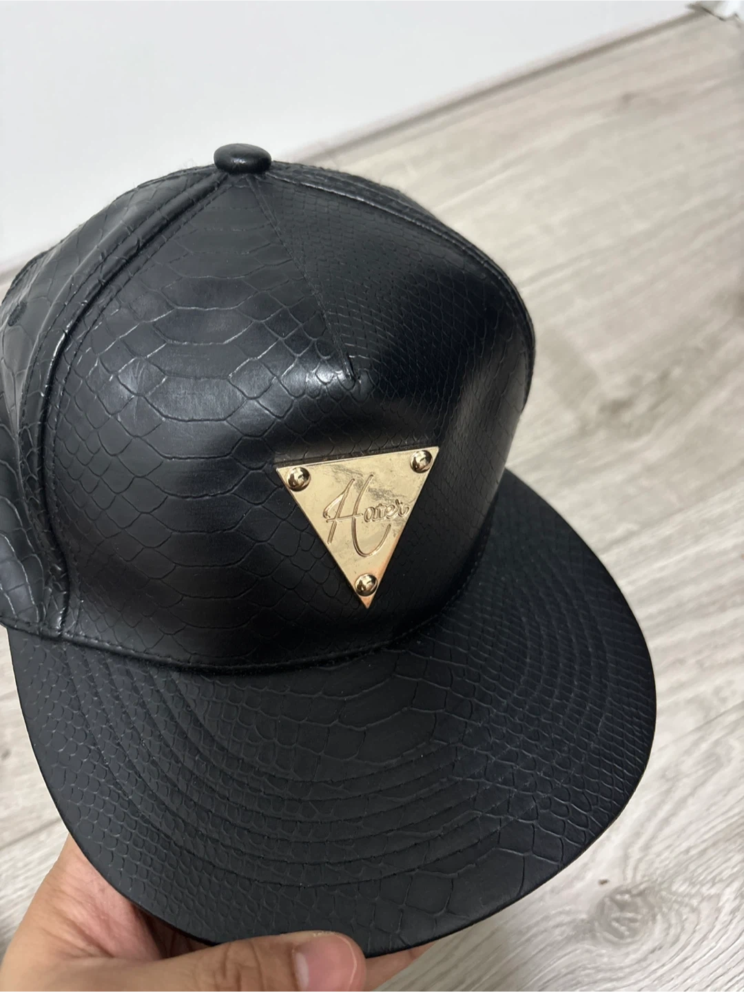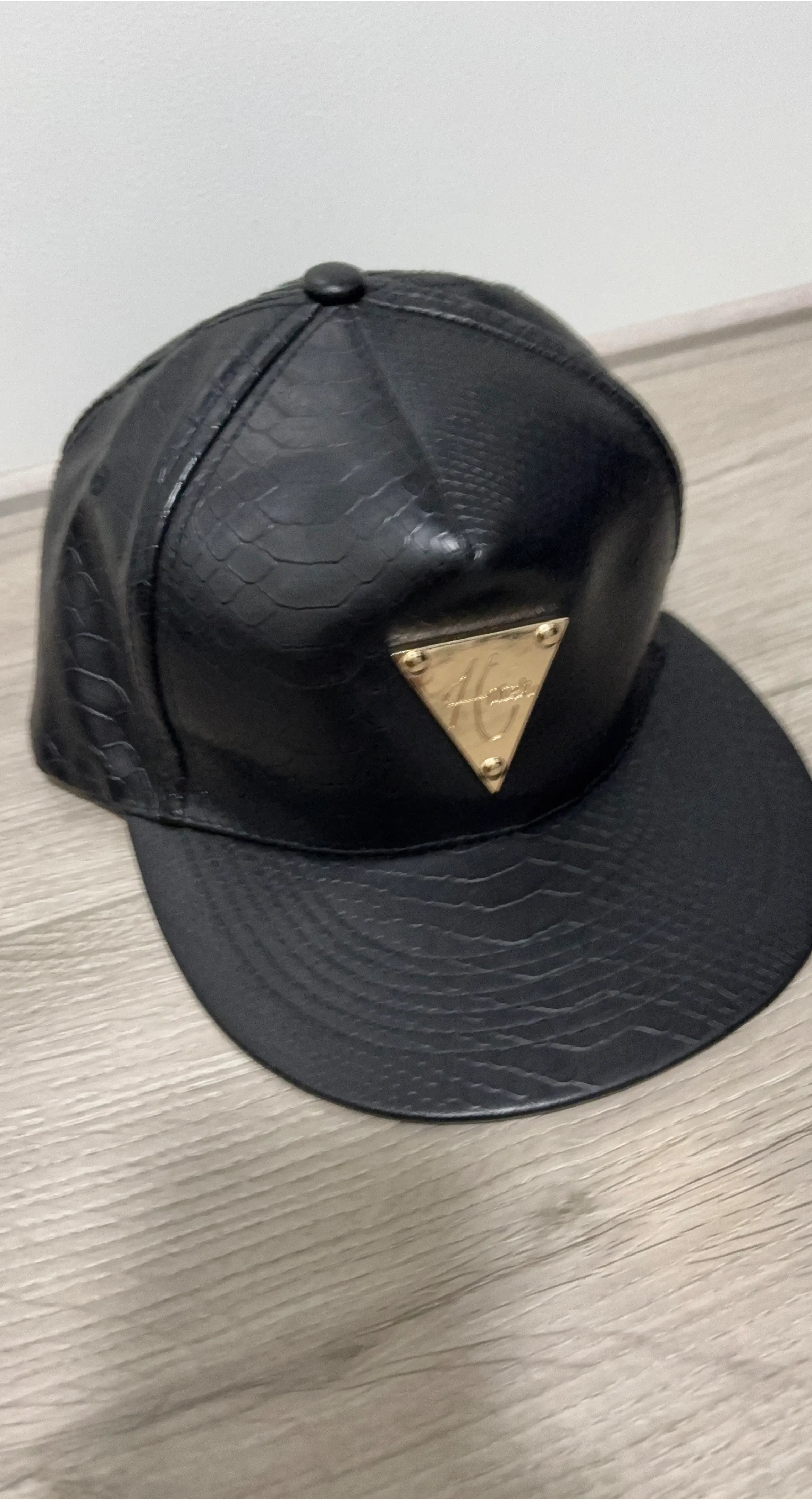 This is a black snapback cap from Hater. It's made with faux leather and features a textured snakeskin design. The cap has an adjustable strap at the back.