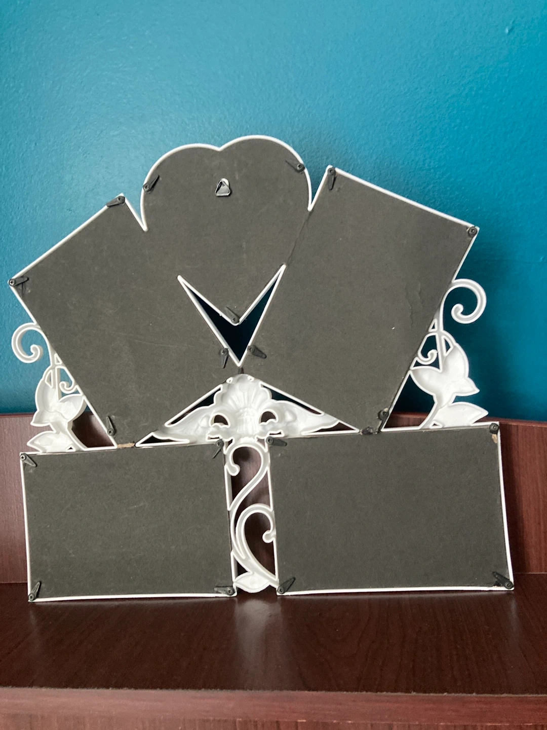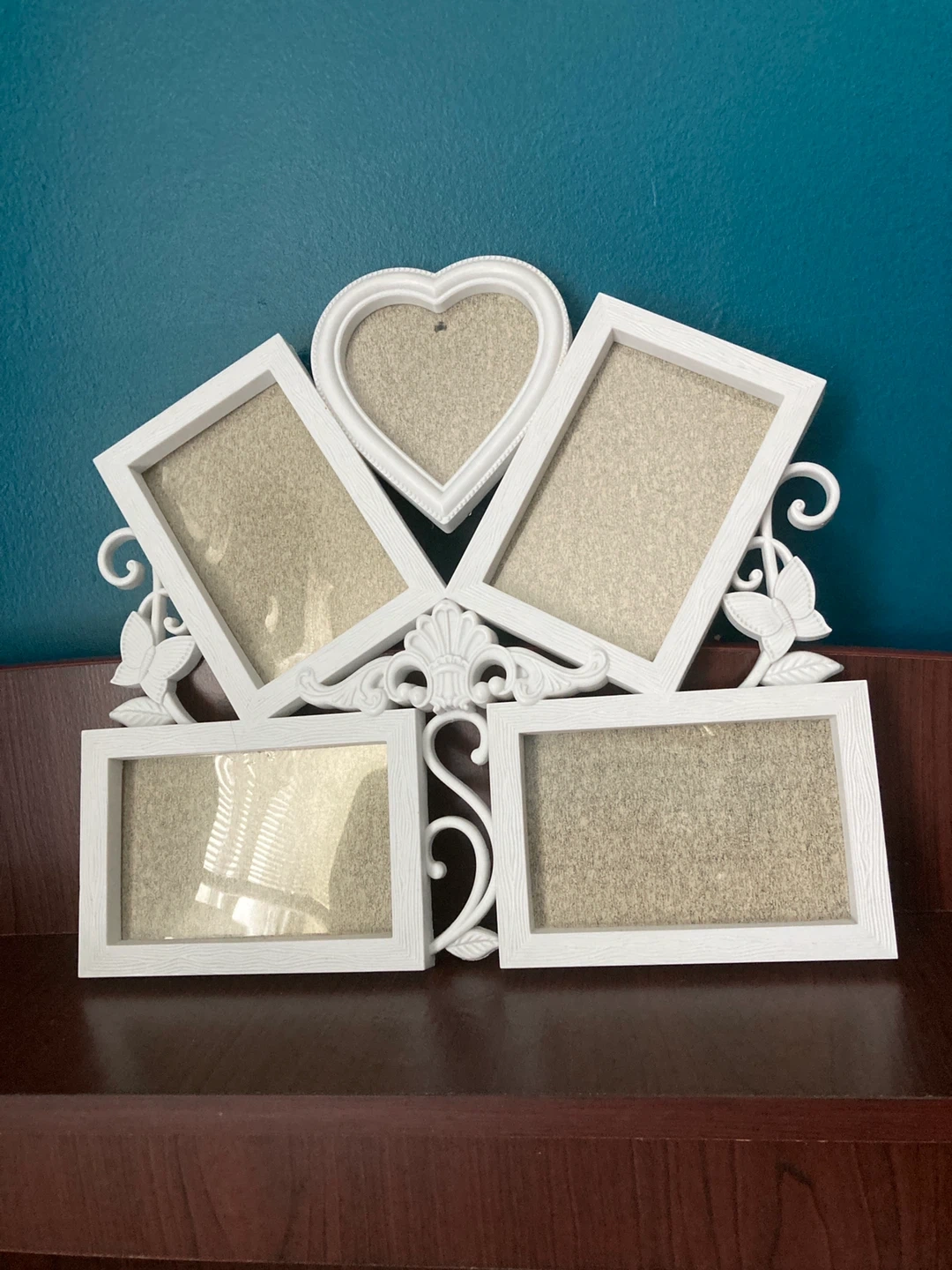 This multi photo frame is white and features a decorative heart detail at the top. It holds multiple pictures and has ornate scrollwork along the sides. It's great for displaying cherished memories!