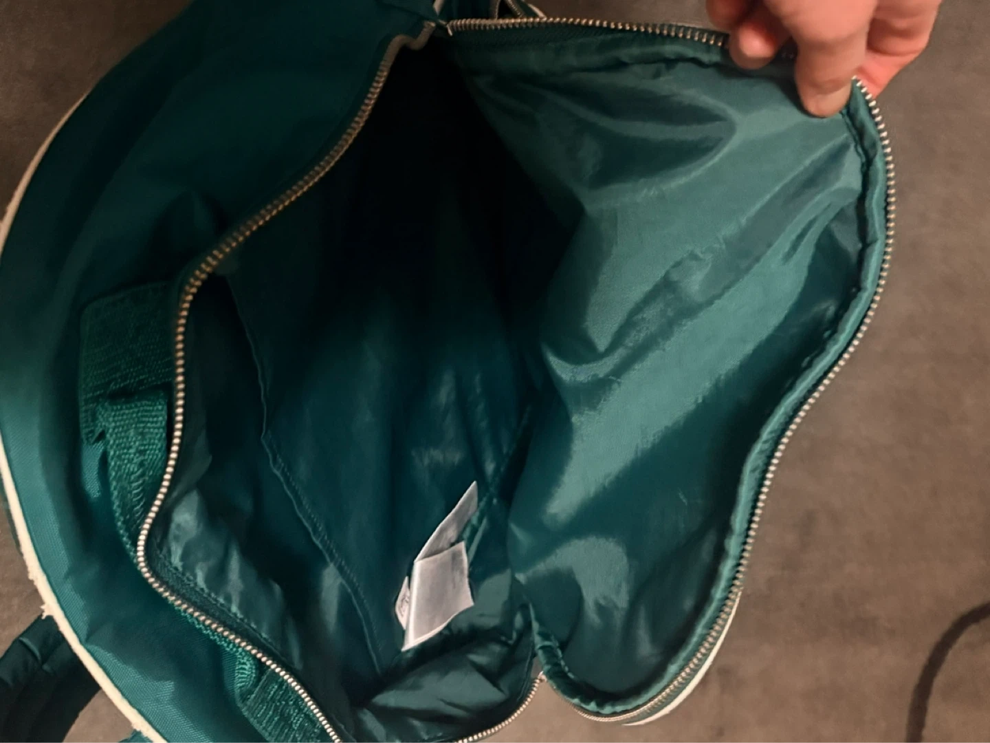 This is a vintage Adidas backpack with the white trim. It has a main compartment and a front zippered pocket. The straps are adjustable.