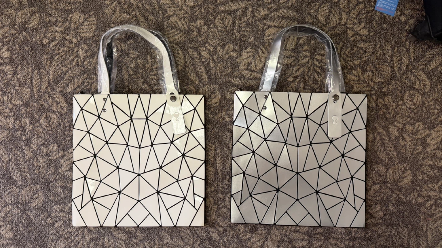 Two stylish geometric tote bags! One is white and the other is silver. They're both brand new. $40 each or $70 for two.