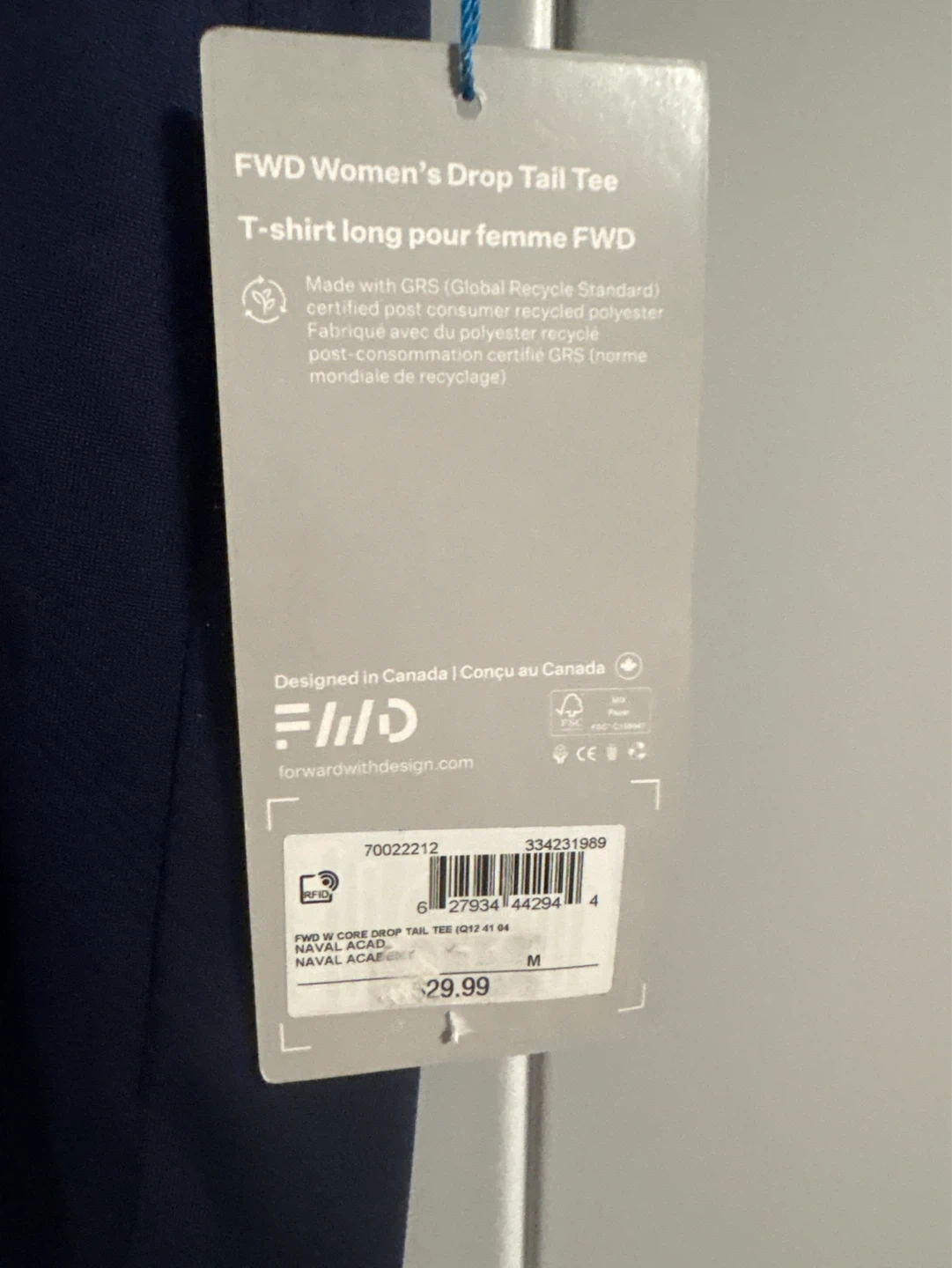 This FWD women's drop tail tee is made with GRS certified recycled polyester. It's designed in Canada. Mesh paneling at the hem provides breathability.