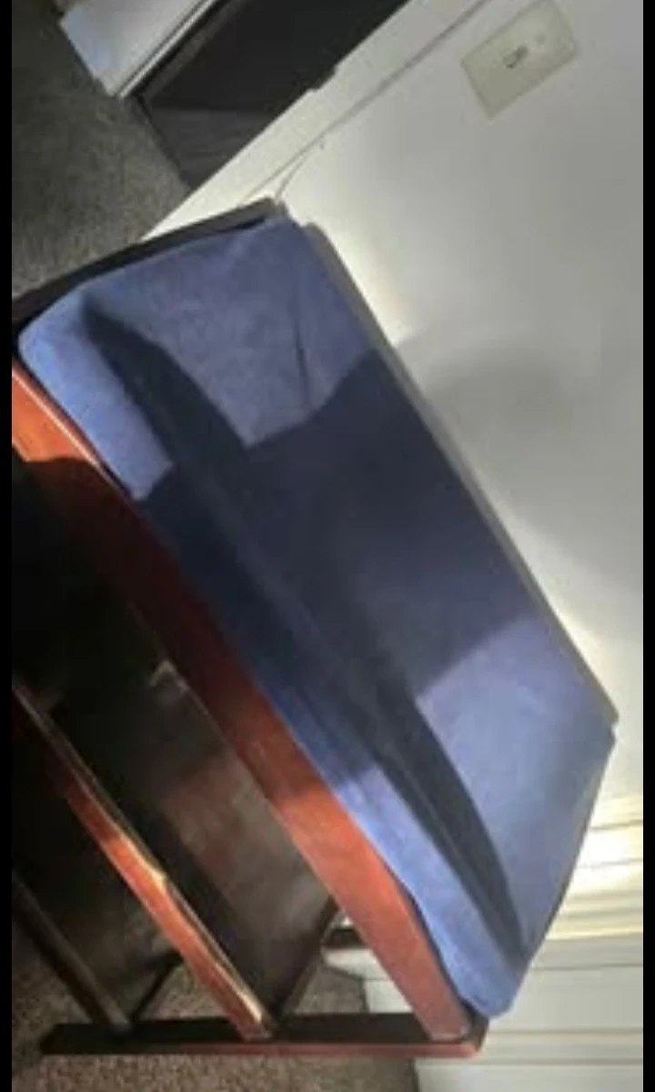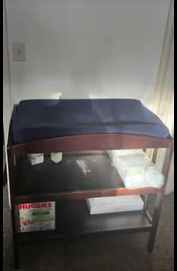 A sturdy wooden baby changing table with two shelves for storage. It includes a navy blue changing pad. This table is great for keeping your baby's essentials organized and accessible during diaper changes.