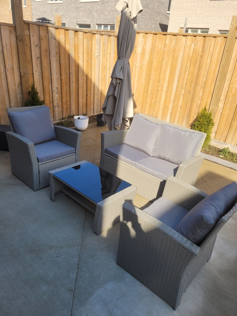 A lovely patio set, perfect for your backyard. This set includes two armchairs, a two-seater sofa, and a coffee table. Wicker-style weave with grey cushions. You can imagine yourself sipping tea in the fresh air.