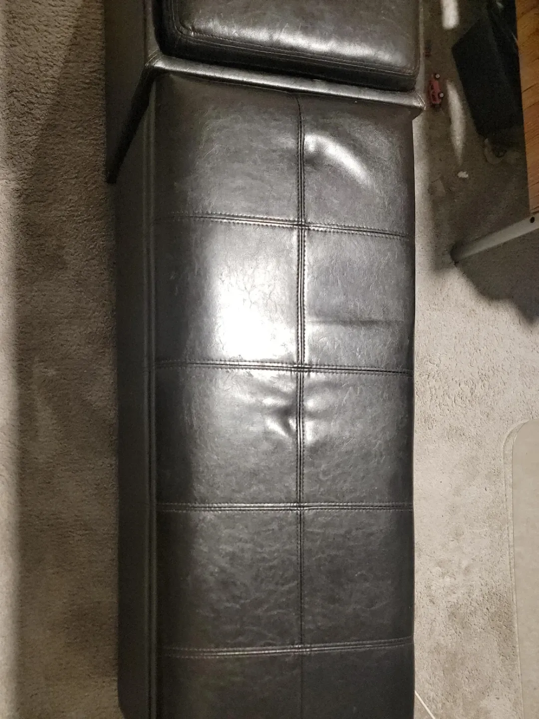 Black faux leather storage ottoman bench with a tufted top. It's perfect for extra seating or storage! Dimensions are approximately 40 inches long by 15 inches wide by 15 inches high.