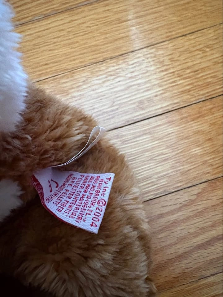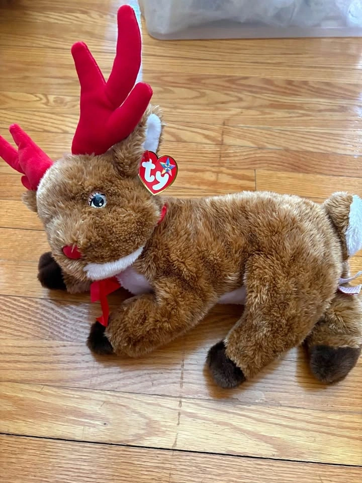 Soft brown plush reindeer with signature red nose and large red antlers. This Ty Beanie Buddy is made of polyester fiber and pellets with white fur accents on neck and tail. It has original tags attached from 2004.