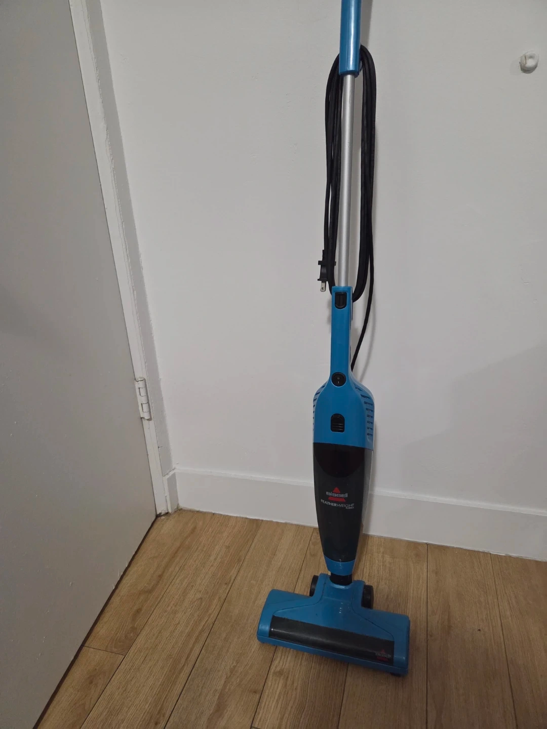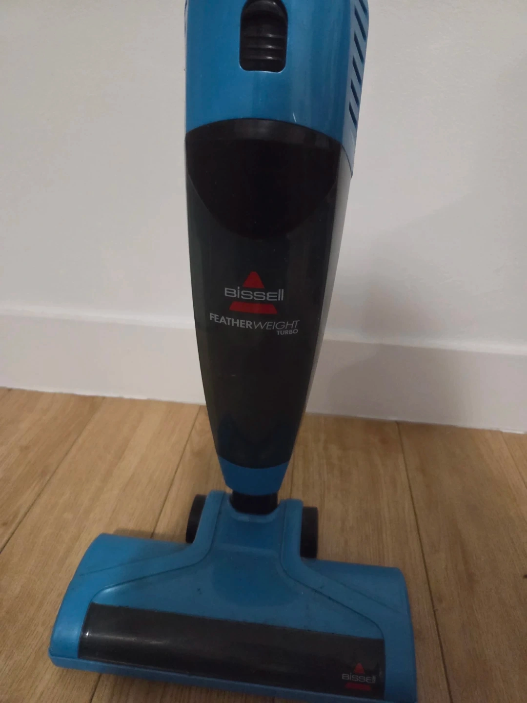 Bissell Featherweight Turbo stick vacuum cleaner in blue. This lightweight vacuum is great for quick cleanups. It's easy to manoeuvre and store.