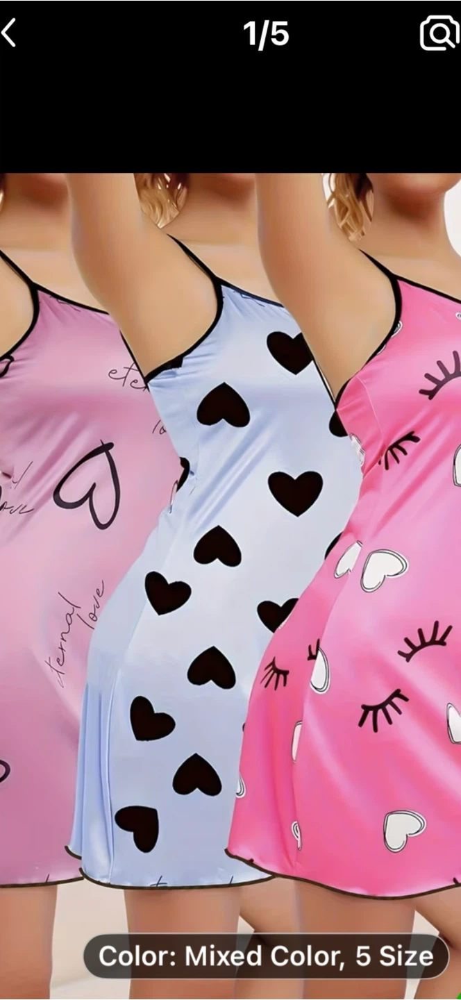 3 Sweetheart printed camisole sleep dresses. These are lightweight and comfy for sleeping. Available in multiple colours and designs. Sizes are listed as 5,fits they are wrinkled from being packed away need to put in dryer