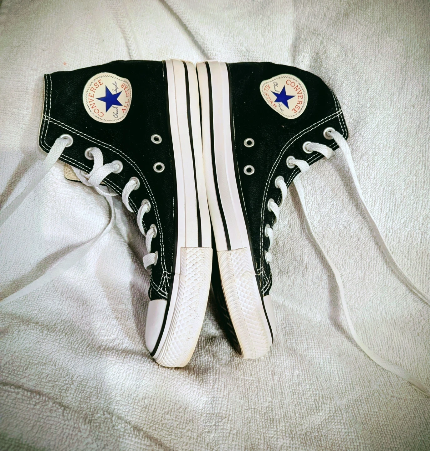 1 pair gently used classic Chuck Taylor sneakers in black and white.
