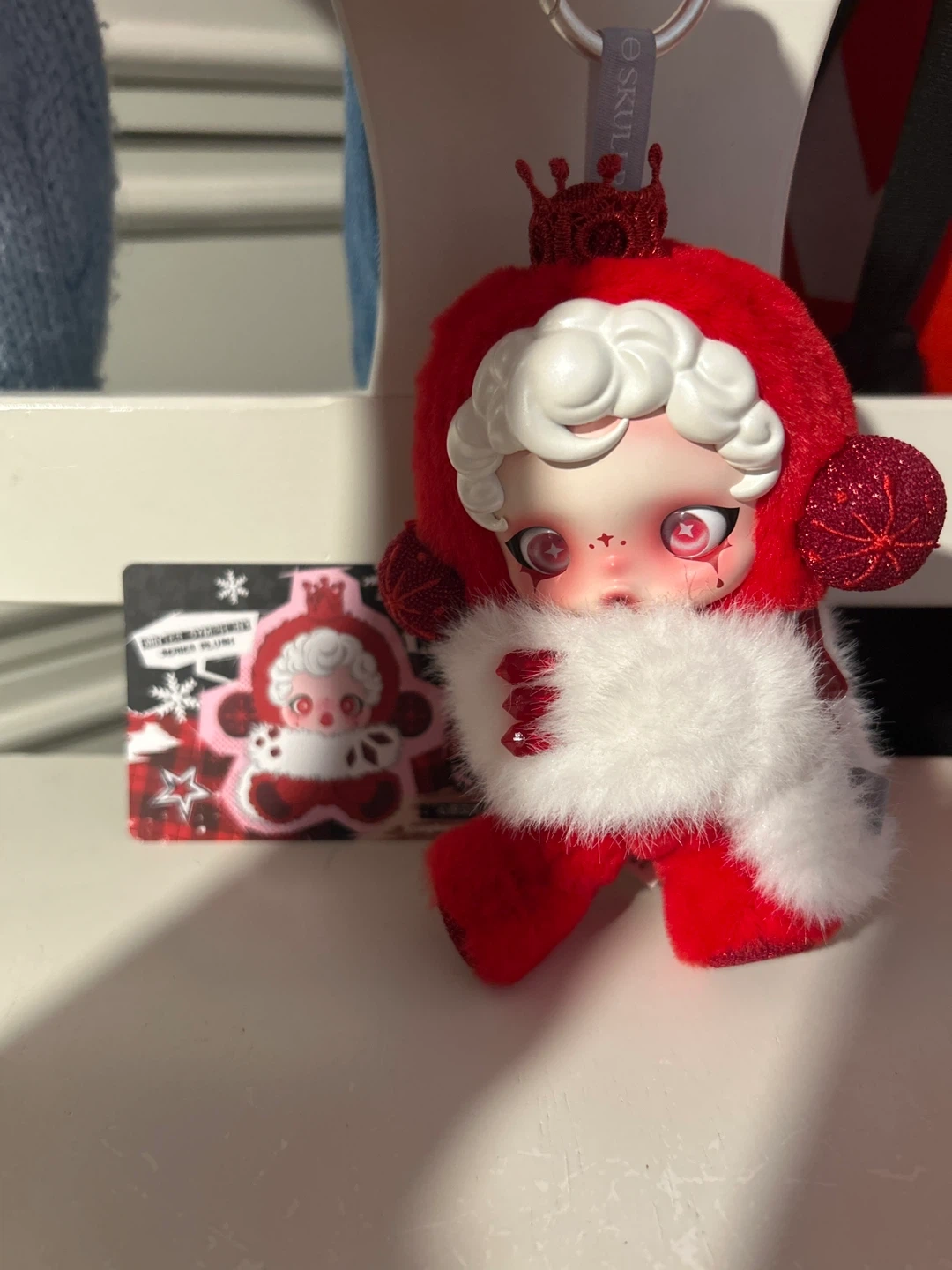 This is a SKULLPANDA x Christmas Series plush toy. It features a fuzzy red exterior with white trim and a sparkly red crown. Great for collectors or holiday decor!