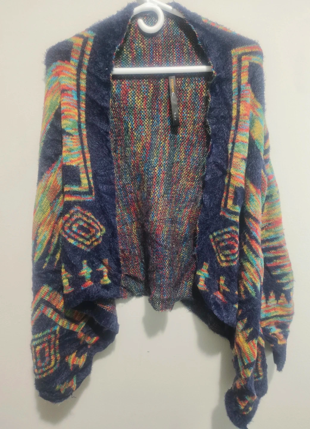 This Reneec. cardigan features a vibrant, multi-coloured geometric pattern with fuzzy navy trim. It's an open-front style, perfect for layering over a simple top. A cozy addition to any fall or winter outfit!