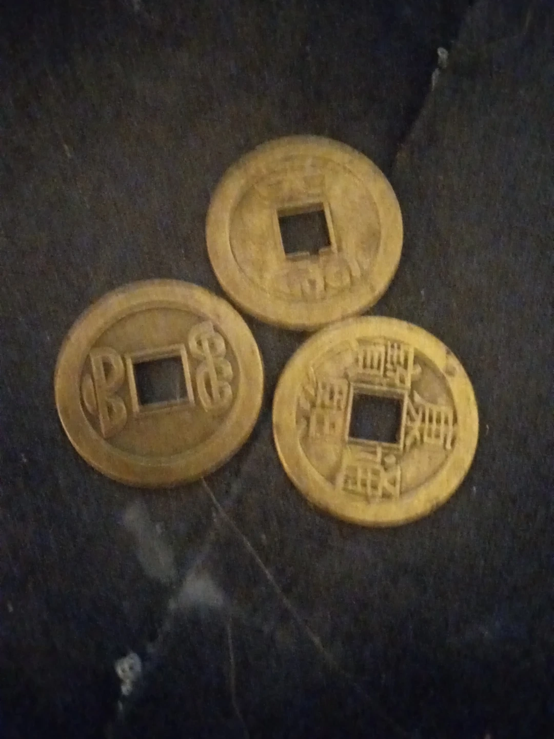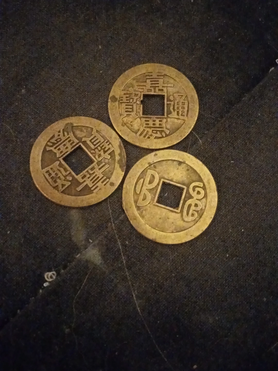 Three vintage-style Chinese coins, each featuring intricate characters and a central square hole. They appear to be made of brass or a similar metal. These coins are commonly used for Feng Shui or as decorative charms.