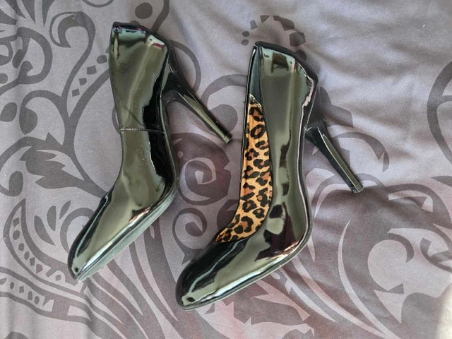 Make a statement with these bold and sophisticated stiletto pumps from G by Guess. They feature a high-shine black patent exterior with a hidden surprise—vibrant leopard print insoles and lining for a touch of "mob wife" luxury aesthetic. Brand: G by Guess. Style: Classic pointed-toe stiletto pump. Finish: Glossy black patent leather with leopard-patterned interior. Heel Height: Approx. 4–5 inch stiletto. Condition: Gently used; light surface wear on soles, but the patent uppers and interior lining are crisp and clean.